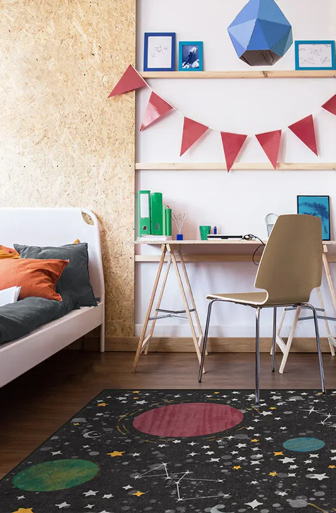 Give your child a rocket ride to the stars with Outer Space Black Rug. This cosmic rug design is filled with textured and brightly colored planets, in hues of arctic blue, evergreen, and rosewood, and surrounded by constellations and starry accents. It's the perfect kids' room rug for your little space explorers.