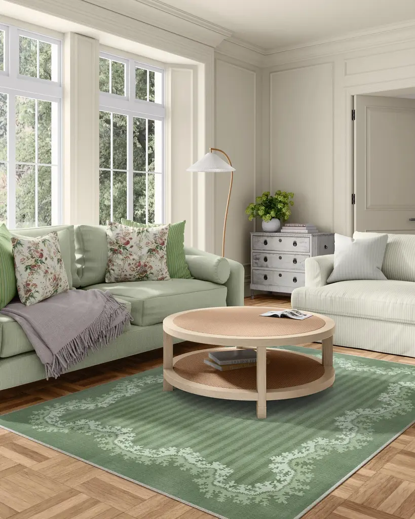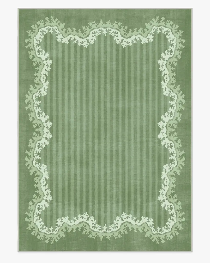 Let imagination in with our Sanderson Oxbow Botanical Green Rug. Referencing Sanderson’s Oxbow pattern, a stylized river design, this rug features tonal stripes and a contrasting organic border that beautifully frames the motif. Shades of green ranging from minty sages to deep evergreens add depth and dimension to the background. Water-resistant, stain-resistant, and machine-washable. Rug colors may vary slightly according to your device and the lighting in your space.