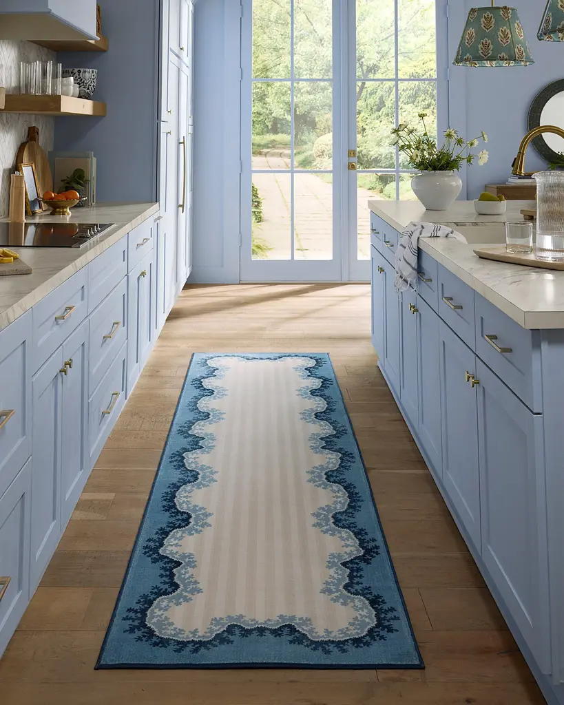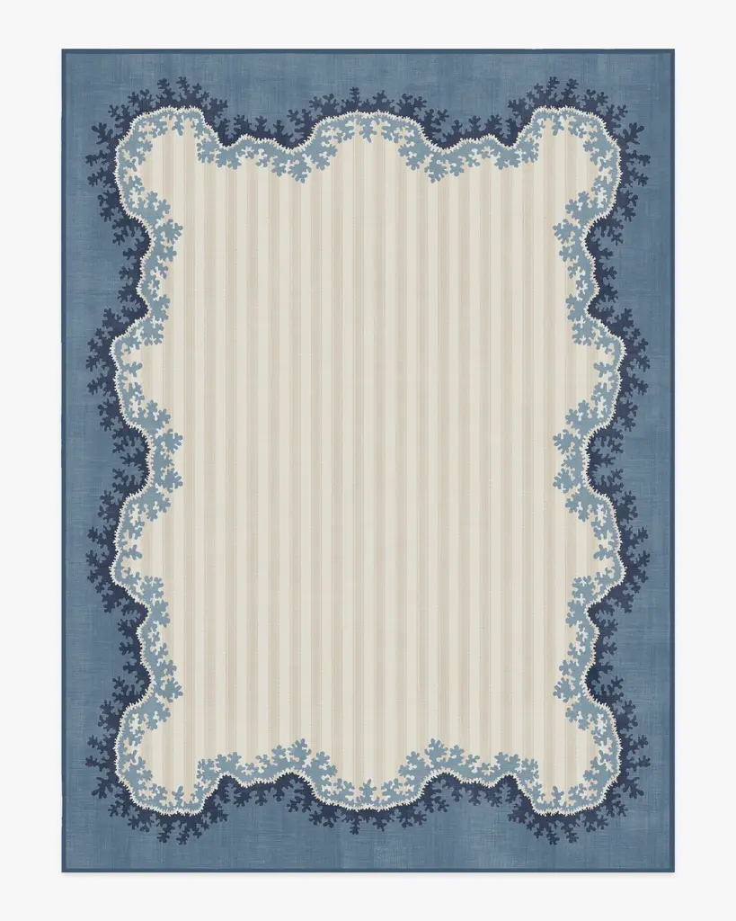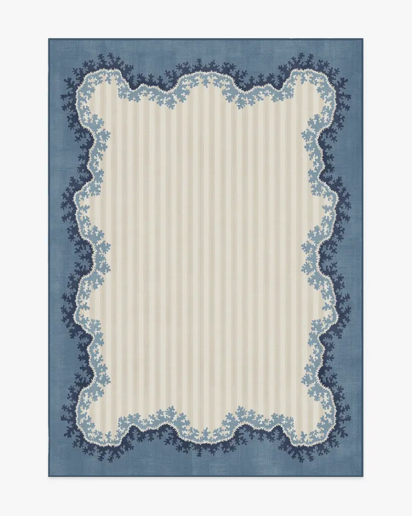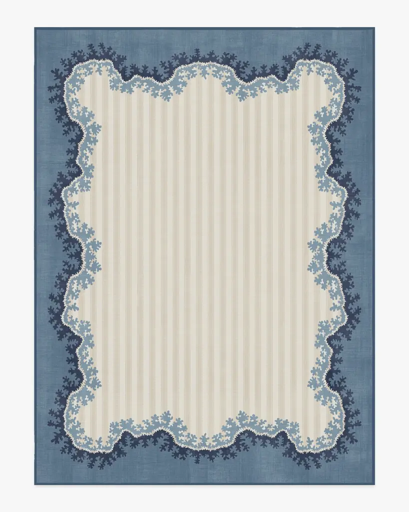 Let imagination in with our Sanderson Oxbow Indigo Rug. Referencing Sanderson’s Oxbow pattern, a stylized river design, this rug features tonal stripes and a contrasting organic border that beautifully frames the motif. Shades of slate blue and navy add depth and dimension to the cream and ivory striped background. Water-resistant, stain-resistant, and machine-washable. Rug colors may vary slightly according to your device and the lighting in your space.