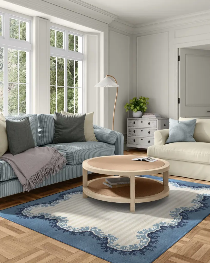 Let imagination in with our Sanderson Oxbow Indigo Rug. Referencing Sanderson’s Oxbow pattern, a stylized river design, this rug features tonal stripes and a contrasting organic border that beautifully frames the motif. Shades of slate blue and navy add depth and dimension to the cream and ivory striped background. Water-resistant, stain-resistant, and machine-washable. Rug colors may vary slightly according to your device and the lighting in your space.