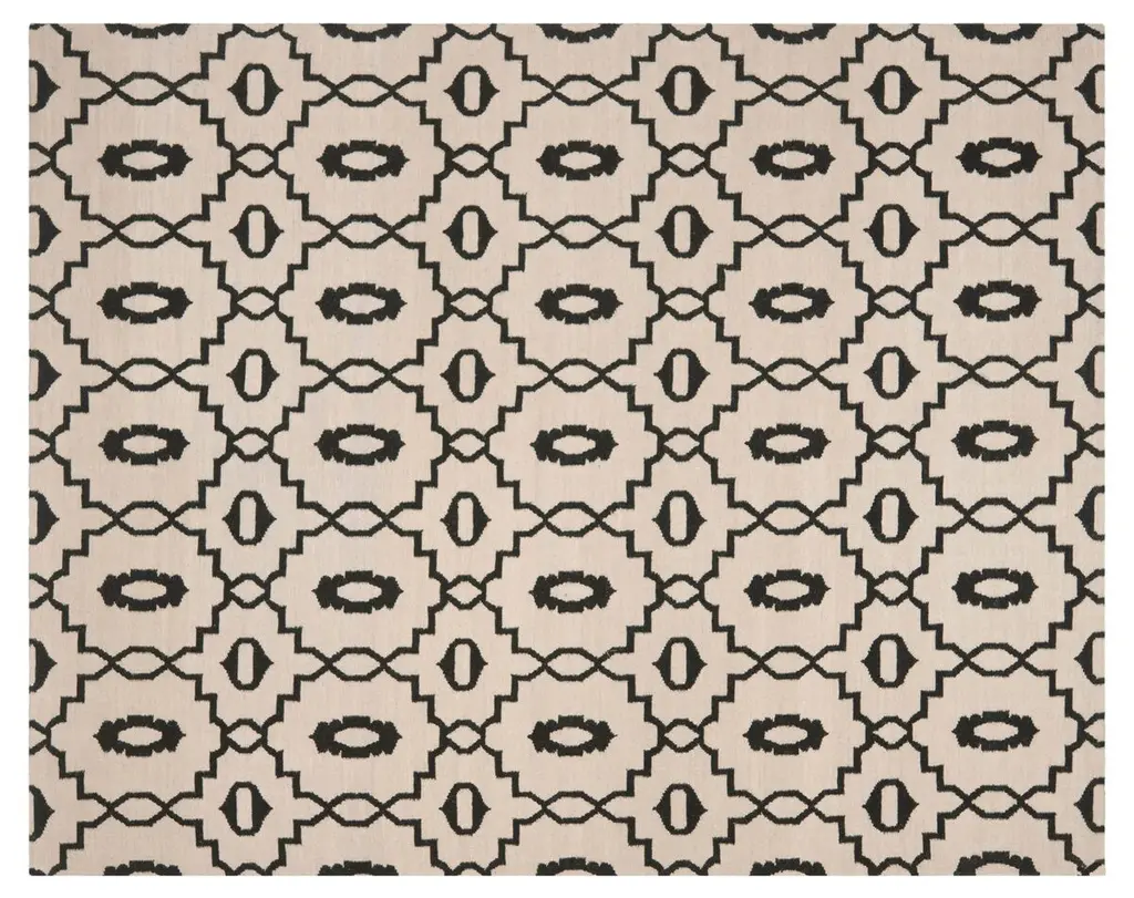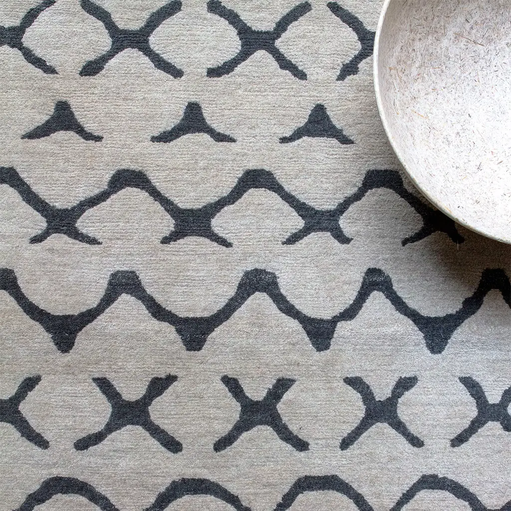 This extraordinary, patterned carpet of bold visual impact will make a statement of its own in both contemporary and traditional interiors. Boasting a delicate beige shade enhanced with a dark gray geometric motif, it is handmade of linen and wool, with the pattern being exclusively made of wool. The perfect addition to a restrained wall or floor thanks to its neutral colour palette.