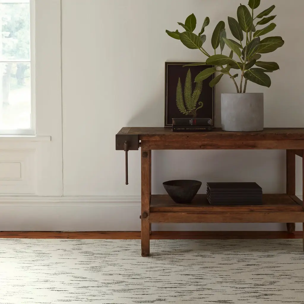 With a randomized light-to-dark gradient pattern, this refined luxury wool rug features a broken stripe effect reminiscent of ikat-dyed Japanese textiles. Created by skilled artisans using a loom with a warp and weft foundation upon which wool threads are hand knotted for a durable, soft, and nubby pile.