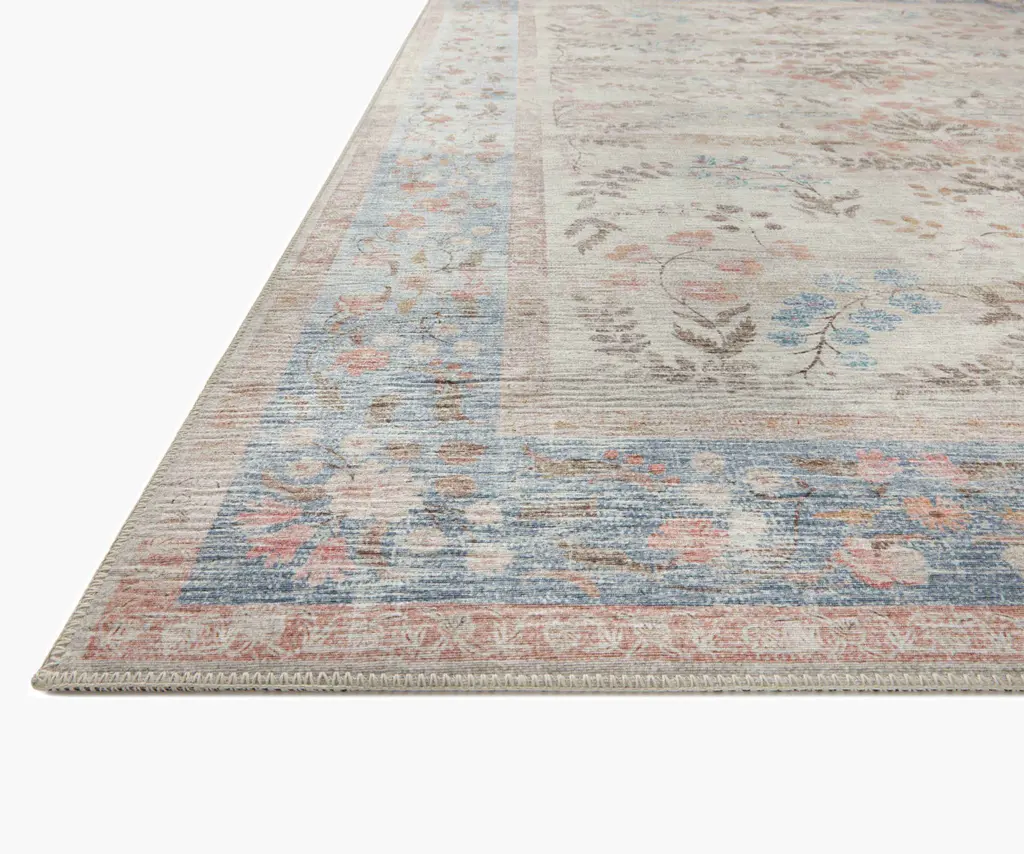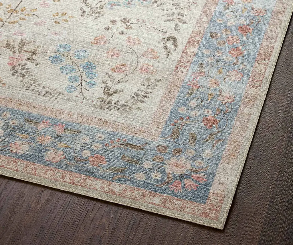 Inspired by the sculpture gardens that flank Kensington Palace, this rug incorporates botanical motifs with cool, slate and blue colors. The style is part of our Palais collection, which marries our signature florals with traditional motifs. Each rug features printed patterns on a soft polyester base that is both colorfast and stain resistant. The layout and scale of our rugs is adjusted to accommodate each available size, and may be different than what is pictured here. Images of each size are available by hovering over the desired size on our desktop site.