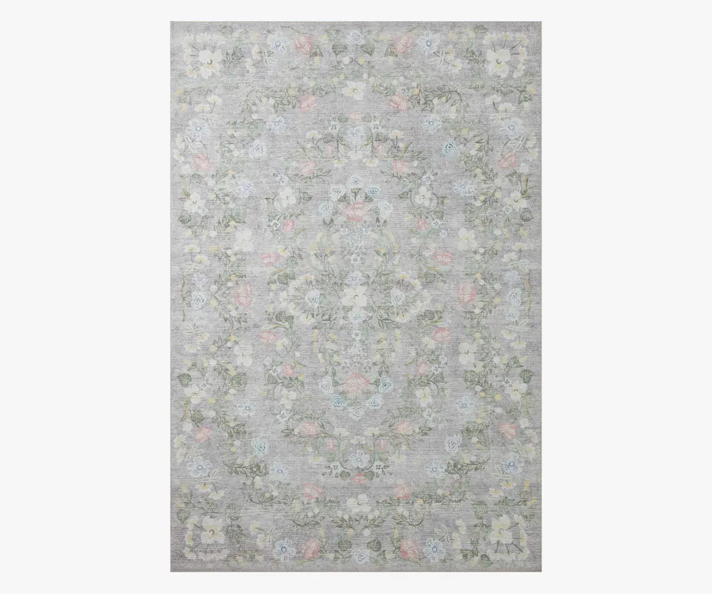 The botanical designs of the Windsor rug encircle a central medallion like a crown, dotted with beautiful blooms. The style is part of our Palais collection, which marries our signature florals with traditional motifs. Each rug features printed patterns on a soft polyester base that is both colorfast and stain resistant. The layout and scale of our rugs is adjusted to accommodate each available size, and may be different than what is pictured here. Images of each size are available by hovering over the desired size on our desktop site.