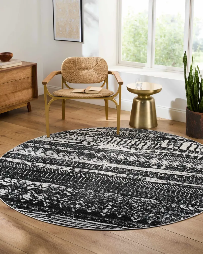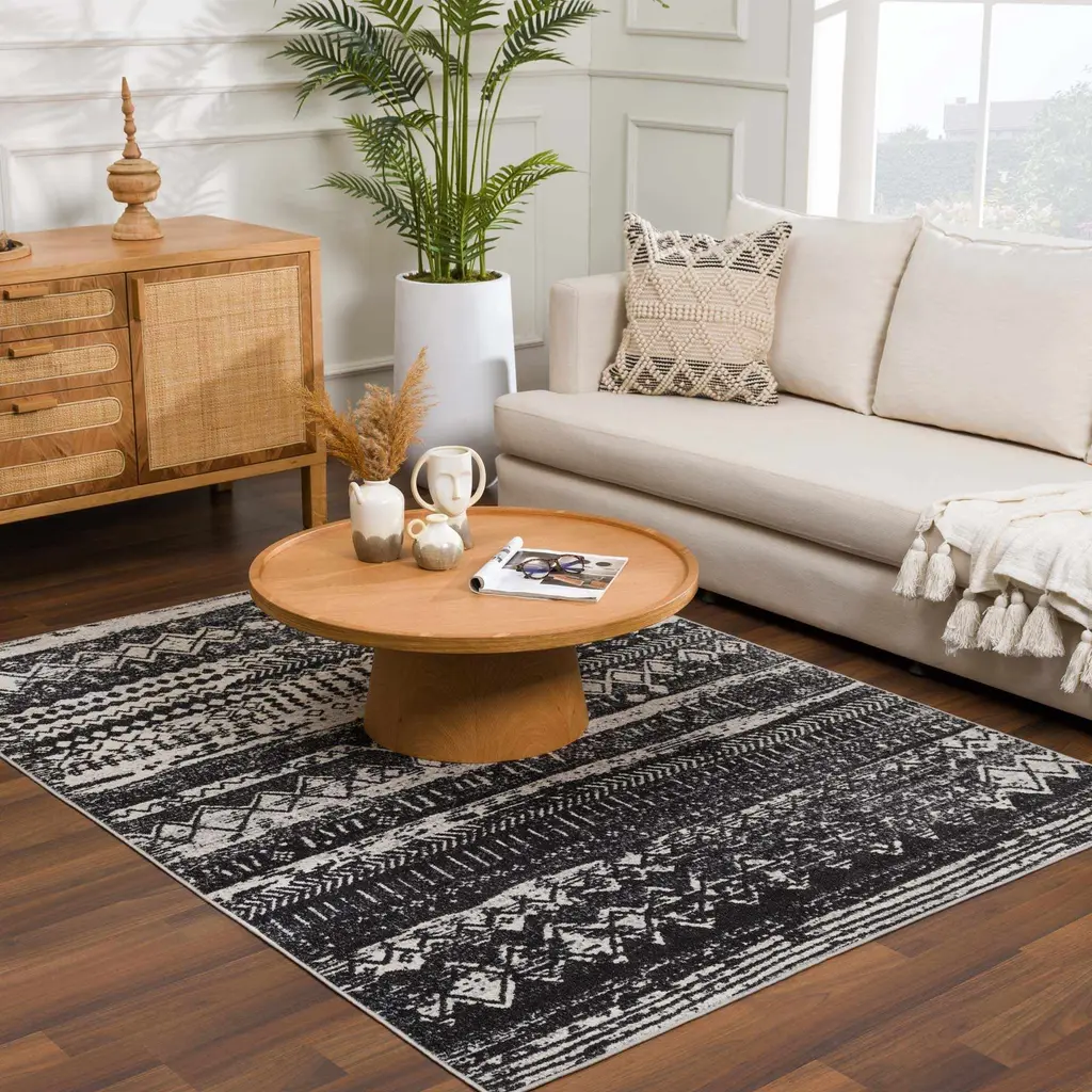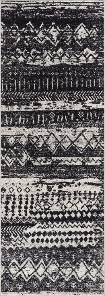 Brand: Hauteloom Collection: Palali Colors: Black, Gray, Light Gray Construction: Machine Woven Material: Face: 100% Polyester Pile: Low Pile Pile Height: 0.12" Styles: Transitional,Bohemian Machine Washable: Yes Made In: Turkey Thickness: 0.16" Price Range: $$$$$ (Most Affordable)