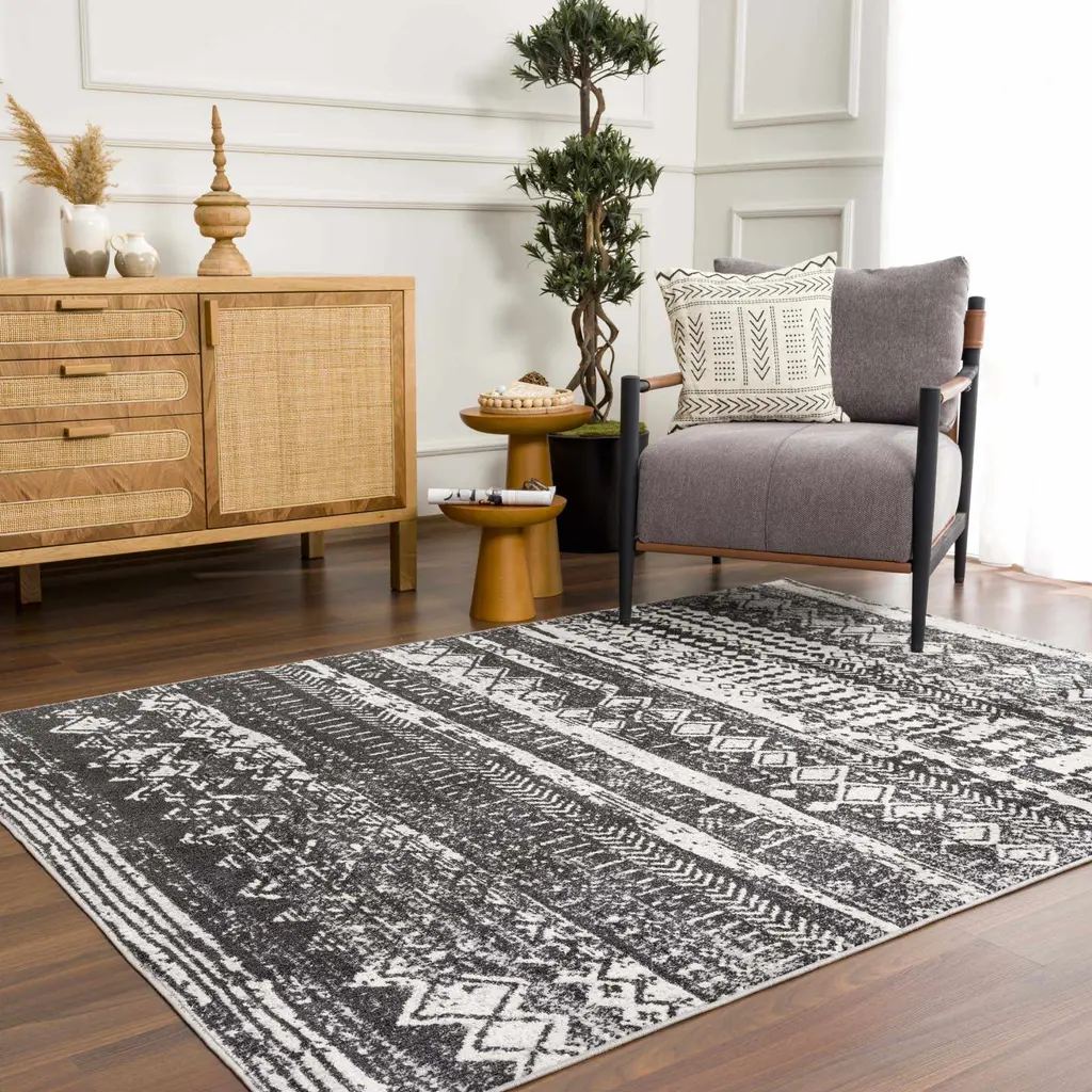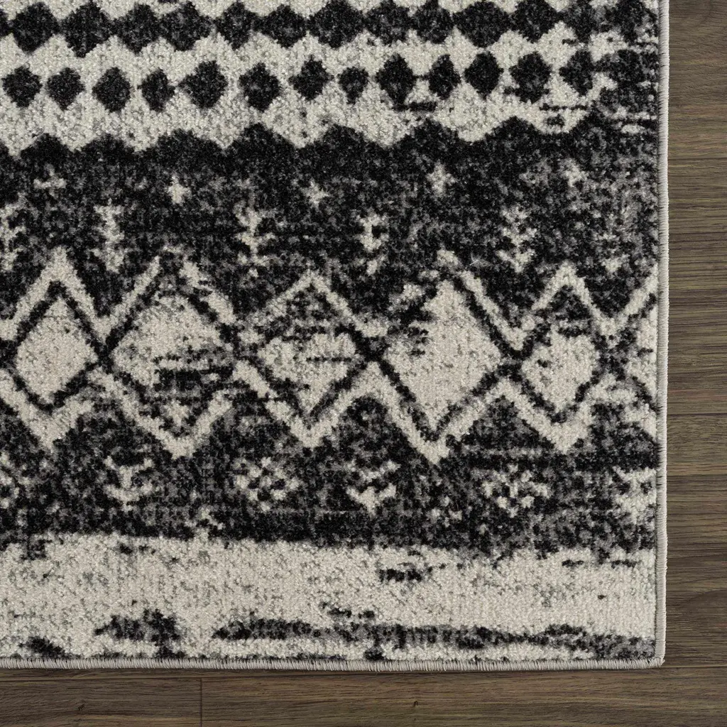 Brand: Hauteloom Collection: Palali Colors: Black, Gray, Light Gray Construction: Machine Woven Material: Face: 100% Polyester Pile: Low Pile Pile Height: 0.12" Styles: Transitional,Bohemian Machine Washable: Yes Made In: Turkey Thickness: 0.16" Price Range: $$$$$ (Most Affordable)