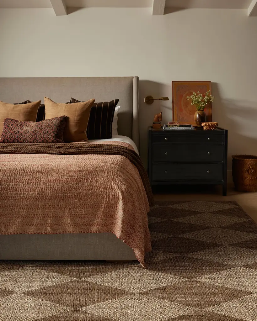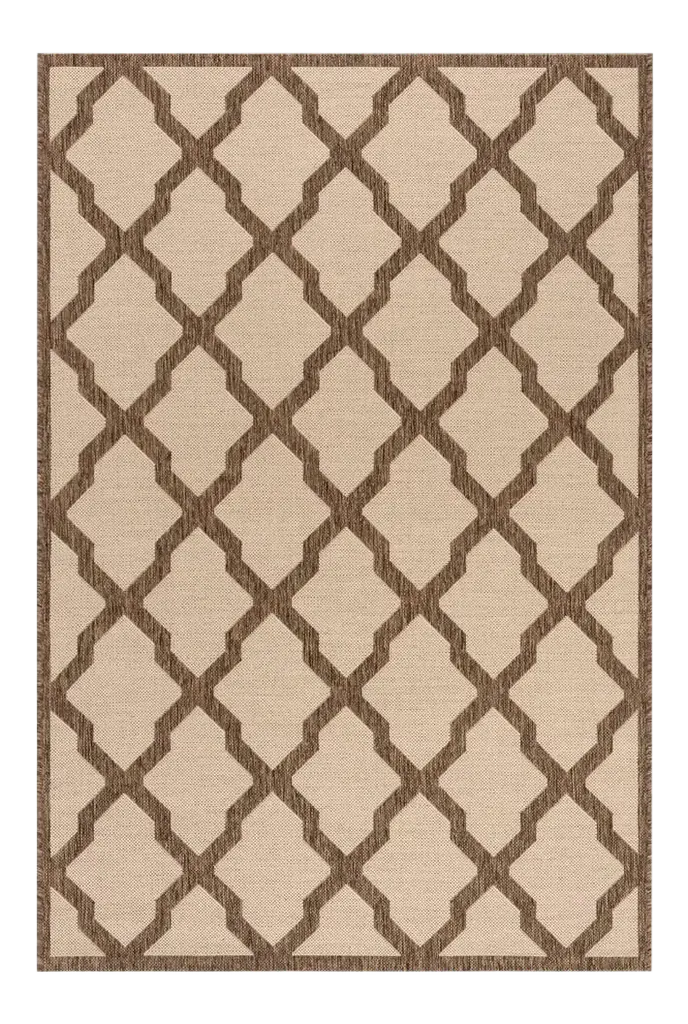 Old-world influence meets modern texture. Our Palazzo Latte Brown Re-Jute Rug features a striking geometric design inspired by the harlequin floors seen in Italian palatial buildings. With a warm palette of saddle brown on a warm beige background, this rug is the perfect balance of simplicity and boldness. The woven jute-like material is made from recycled and virgin polyester, and polyurethane that won't shed or fray. Water-resistant, stain-resistant, and machine-washable.