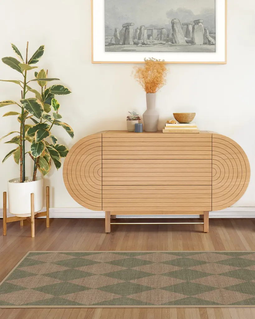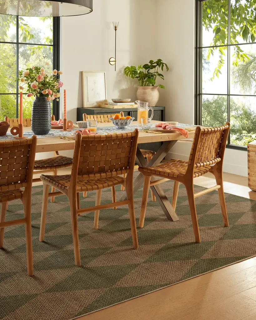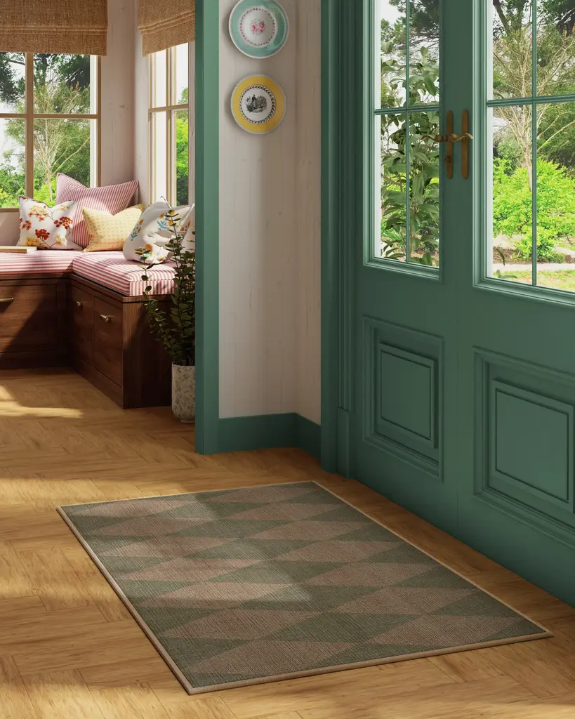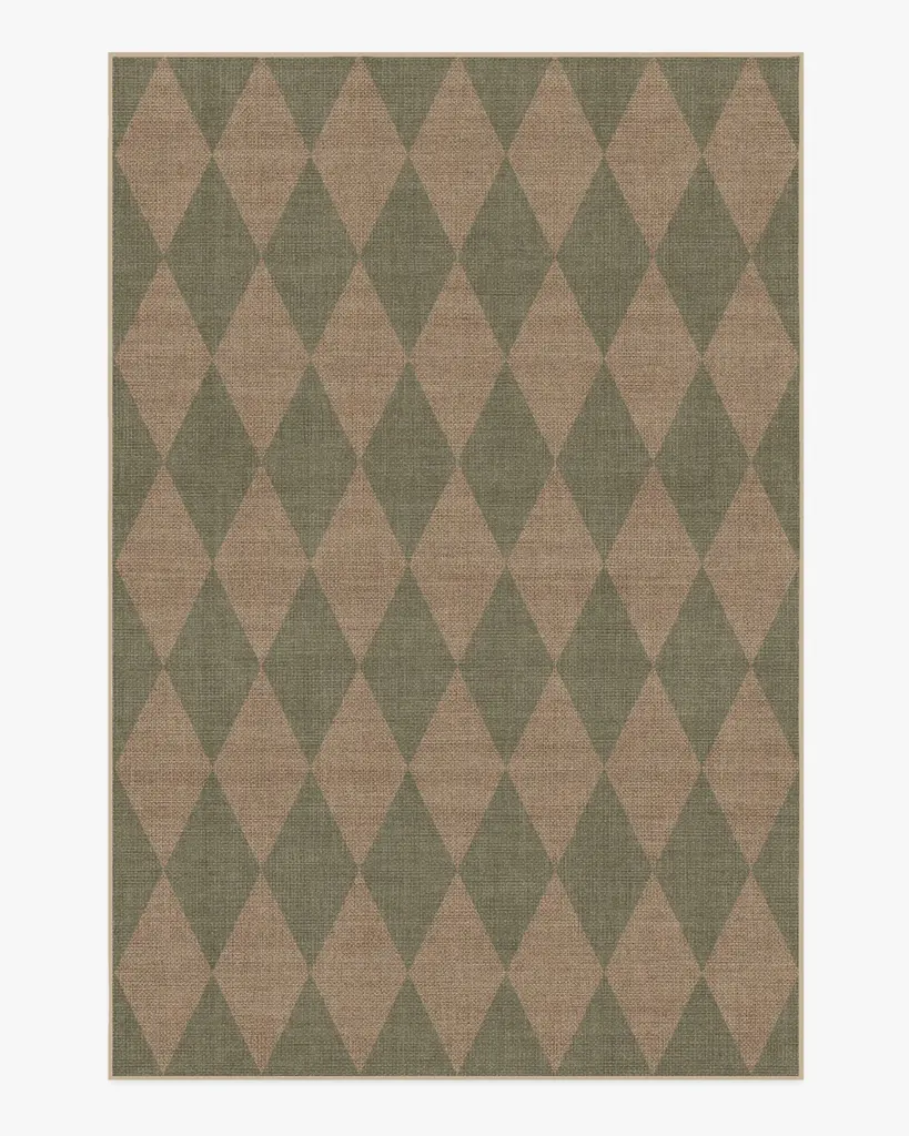 Have a little fun with our Palazzo Sage Green Re-Jute Rug. This desaturated sage green and warm beige diamond design is inspired by the harlequin floors in Italian palatial buildings and will give your space the hint of boldness you've been looking for. The woven jute-like material is made from recycled and virgin polyester, and polyurethane that won't shed or fray. Water-resistant, stain-resistant, and machine-washable.