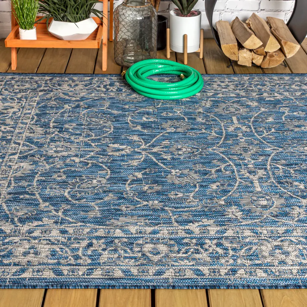 With its twining vines and ornate border, this traditional pattern is an elegant addition to your outdoor porch or patio. Varied tones of blue and navy mingled with a light gray pattern give this rug a rich, hand-woven texture. The flatweave design is great for high-traffic spaces indoors too. Features:• Flat-weave construction of 100% polypropylene• Gray and navy with a handwoven mingled texture• Water resistance with 0.19" pile• 100% Polypropylene• No backing, use of rug pad is recommended (sold separately)• Power Loomed in Turkey• Actual Dimension: 3ft. 11 in. x 6 ft.• Color: Navy/Gray• Thickness measures: 0.19 in.• Available in multiple sizes and/or colorsRug Care:• Durable and easy-care - just sweep or hose down with mild soap and water• Packing and shipping may cause temporary creases in rugs, which will flatten out after a week on the floor; to expedite the process, try back-rolling your rug before laying it down, and then allow ample time for the remaining creases to relax• Please Note: Due to differences in monitors, some rug colors may vary slightly. Lengths and widths may vary from the published dimensions. Patterns may vary slightly according to shape and size selected.About us:Style your floors with JONATHAN Y. By combining fine craftsmanship and design, this New York creative studio is bringing fashion to your floors. The collection mixes sustainable organic materials, vibrant colors and trend worthy styles to create JONATHAN Y''s distinctive catalog of rugs.