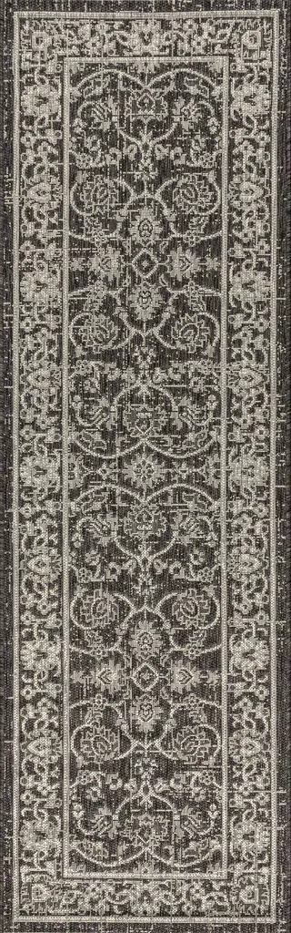 With its twining vines and ornate border, this traditional pattern is an elegant addition to your outdoor porch or patio. Varied tones of charcoal and black mingled with a light gray pattern give this rug a rich, hand-woven texture. The flatweave design is great for high-traffic spaces indoors too.