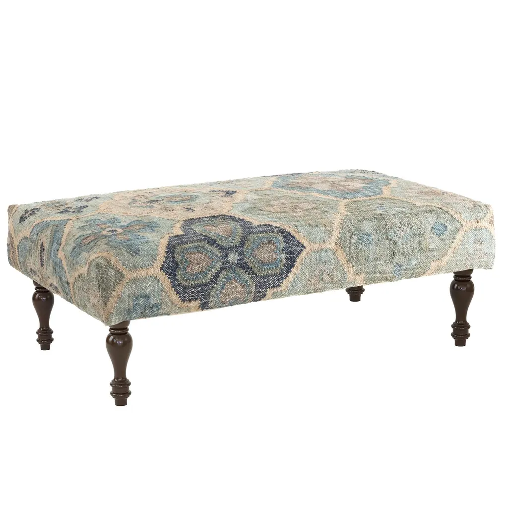 Love our Pali Handwoven Jute Rug? Reimagined and upholstered from one of our favorite rugs, this ottoman becomes a contemporary collectible. Attractively upholstered in quatrefoil medallions in shades of denim, natural and ivory, woven in hardworking jute, with a touch of cotton for softness. The cushioned ottoman is held aloft by a choice of shapely turned-wood legs in a variety of finishes. An ideal placement for front of sofa or end of bed, doing double duty as occasional seating and staging area for a tray. This supersmart addition to entryway, living room or bedroom is a versatile investment piece, available in two sizes.