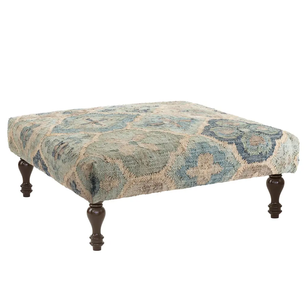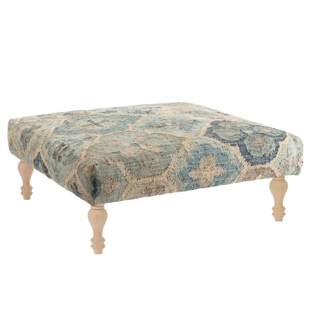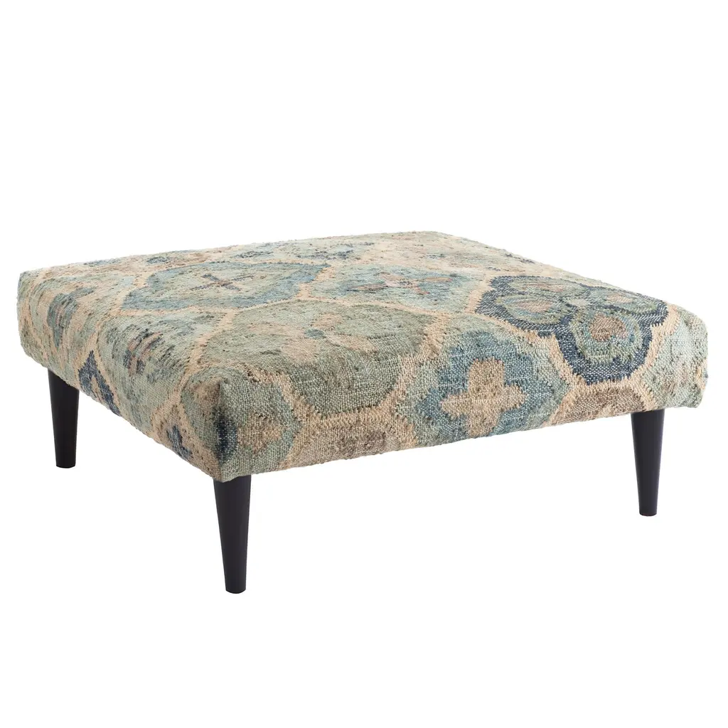 Love our Pali Handwoven Jute Rug? Reimagined and upholstered from one of our favorite rugs, this ottoman becomes a contemporary collectible. Attractively upholstered in quatrefoil medallions in shades of denim, natural and ivory, woven in hardworking jute, with a touch of cotton for softness. The cushioned ottoman is held aloft by a choice of shapely turned-wood legs in a variety of finishes. An ideal placement for front of sofa or end of bed, doing double duty as occasional seating and staging area for a tray. This supersmart addition to entryway, living room or bedroom is a versatile investment piece, available in two sizes.