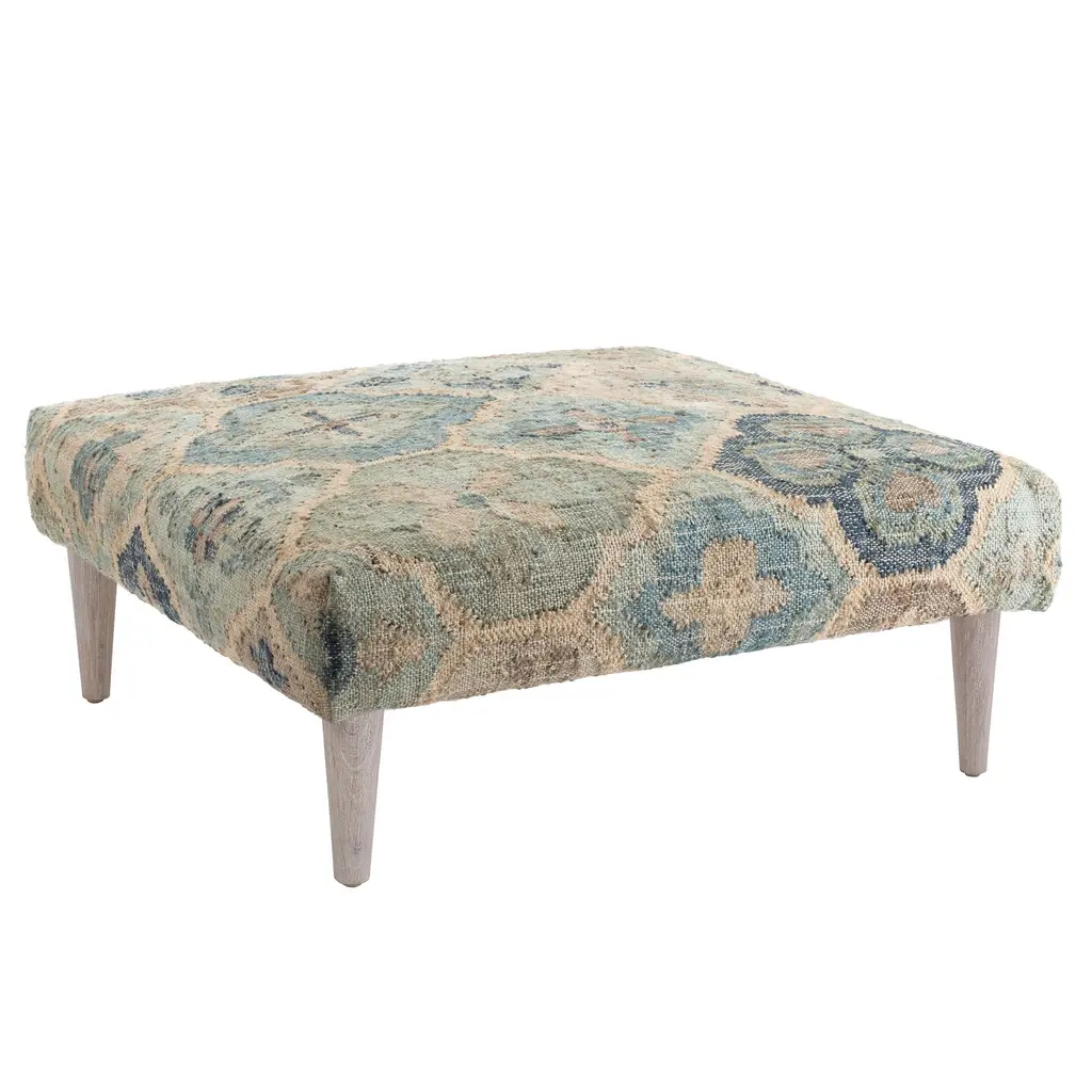 Love our Pali Handwoven Jute Rug? Reimagined and upholstered from one of our favorite rugs, this ottoman becomes a contemporary collectible. Attractively upholstered in quatrefoil medallions in shades of denim, natural and ivory, woven in hardworking jute, with a touch of cotton for softness. The cushioned ottoman is held aloft by a choice of shapely turned-wood legs in a variety of finishes. An ideal placement for front of sofa or end of bed, doing double duty as occasional seating and staging area for a tray. This supersmart addition to entryway, living room or bedroom is a versatile investment piece, available in two sizes.