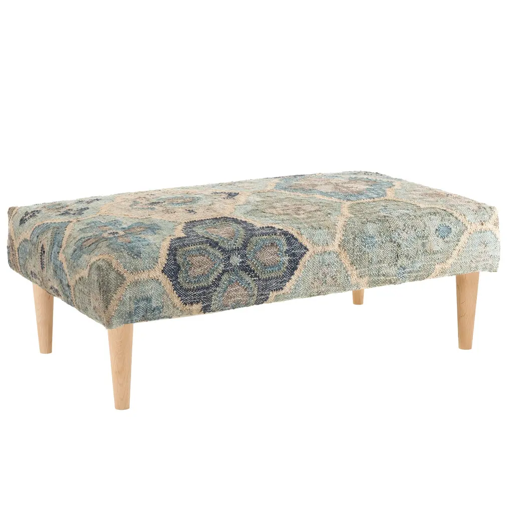 Love our Pali Handwoven Jute Rug? Reimagined and upholstered from one of our favorite rugs, this ottoman becomes a contemporary collectible. Attractively upholstered in quatrefoil medallions in shades of denim, natural and ivory, woven in hardworking jute, with a touch of cotton for softness. The cushioned ottoman is held aloft by a choice of shapely turned-wood legs in a variety of finishes. An ideal placement for front of sofa or end of bed, doing double duty as occasional seating and staging area for a tray. This supersmart addition to entryway, living room or bedroom is a versatile investment piece, available in two sizes.