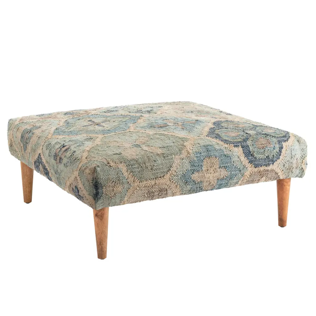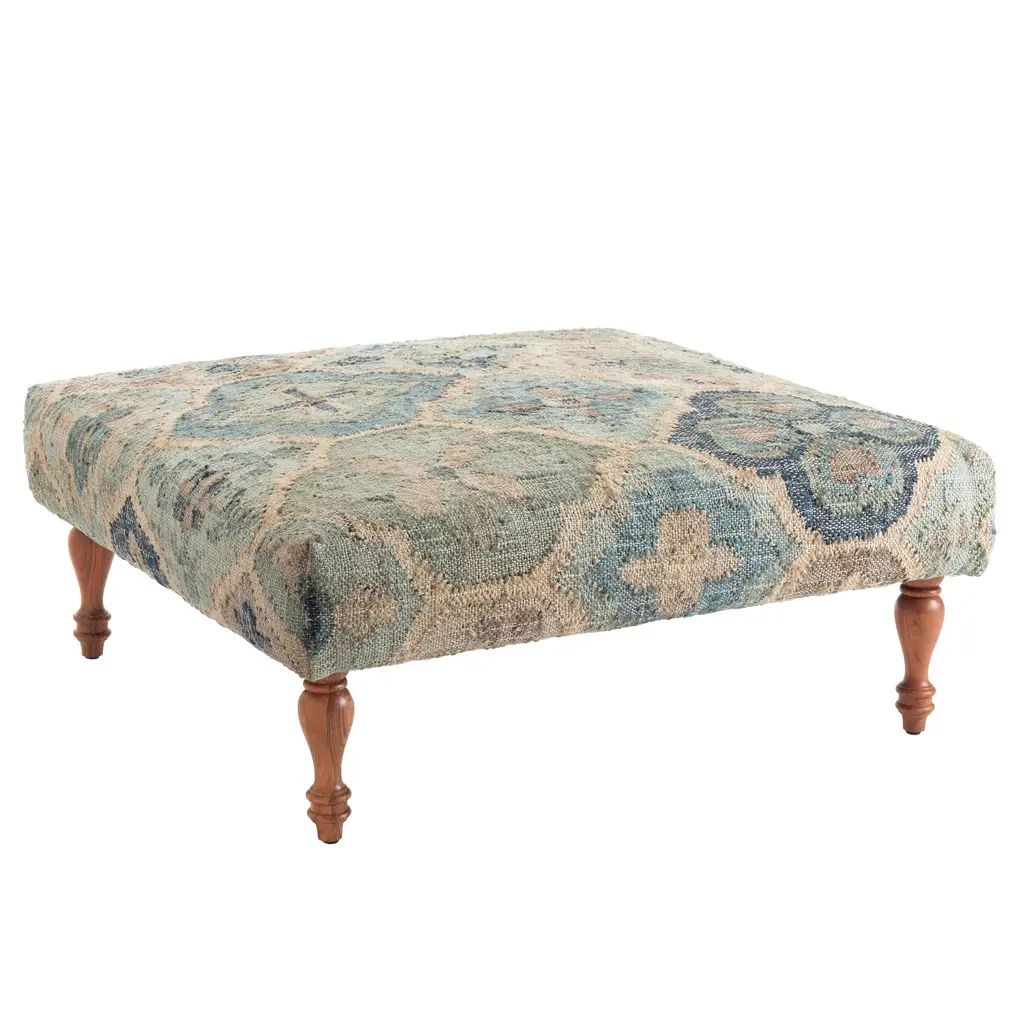 Love our Pali Handwoven Jute Rug? Reimagined and upholstered from one of our favorite rugs, this ottoman becomes a contemporary collectible. Attractively upholstered in quatrefoil medallions in shades of denim, natural and ivory, woven in hardworking jute, with a touch of cotton for softness. The cushioned ottoman is held aloft by a choice of shapely turned-wood legs in a variety of finishes. An ideal placement for front of sofa or end of bed, doing double duty as occasional seating and staging area for a tray. This supersmart addition to entryway, living room or bedroom is a versatile investment piece, available in two sizes.