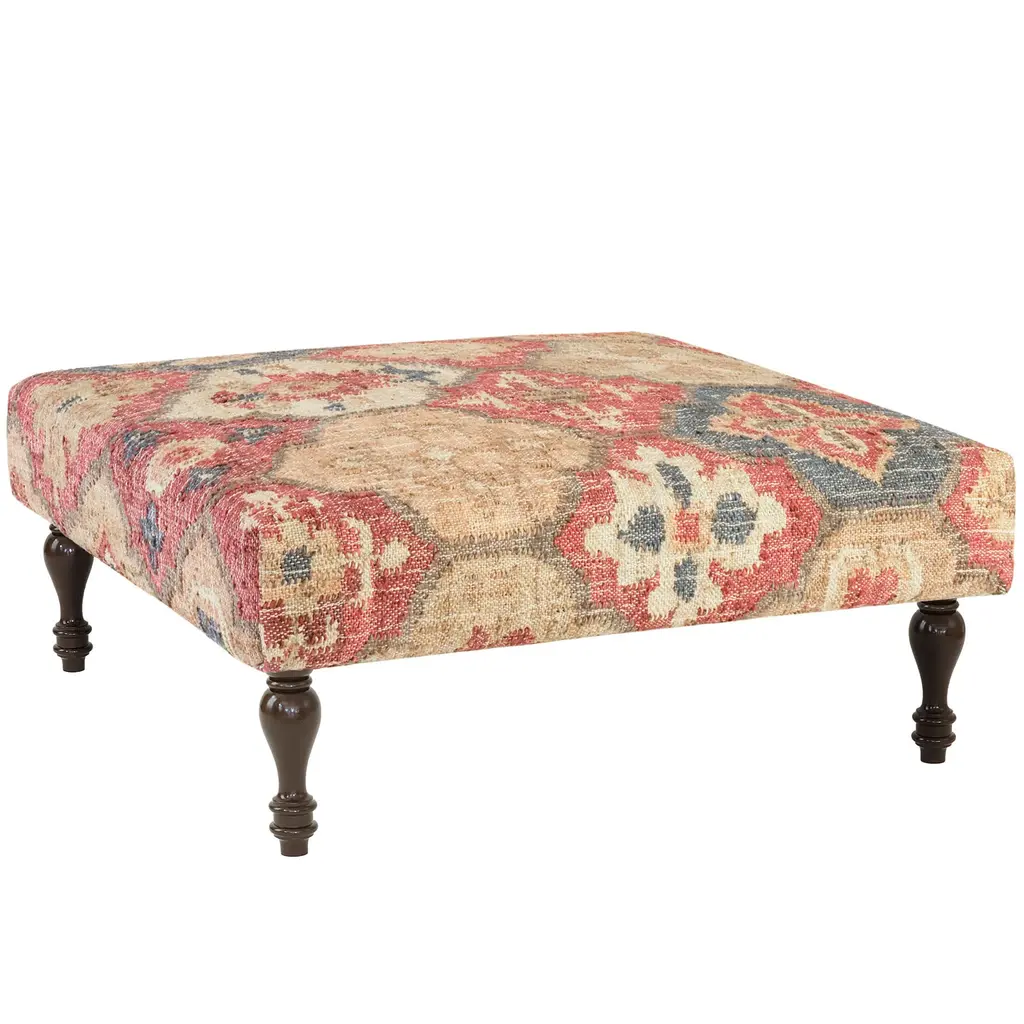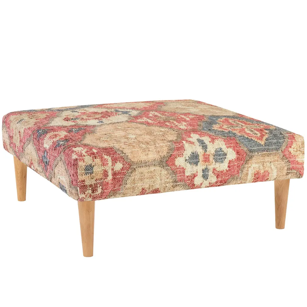 Love our Pali Handwoven Jute Rug? Reimagined and upholstered from one of our favorite rugs, this ottoman becomes a contemporary collectible. Attractively upholstered in quatrefoil medallions in shades of denim, natural and ivory, woven in hardworking jute, with a touch of cotton for softness. The cushioned ottoman is held aloft by a choice of shapely turned-wood legs in a variety of finishes. An ideal placement for front of sofa or end of bed, doing double duty as occasional seating and staging area for a tray. This supersmart addition to entryway, living room or bedroom is a versatile investment piece, available in two sizes.