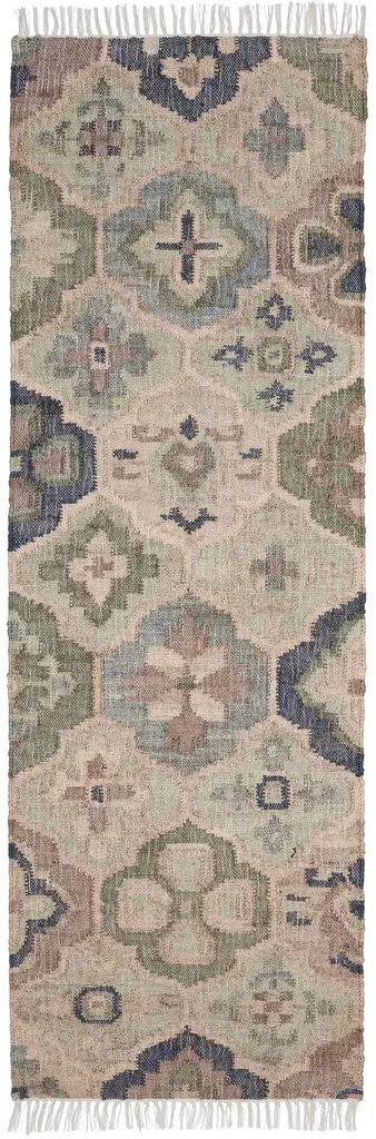 Timeless quatrefoil medallions in shades of sky, denim, natural and ivory, dhurrie woven from hardworking jute, with a touch of cotton for softness. Sustainable, biodegradable and renewable, jute adds orglamic character and rustic chic to any room.