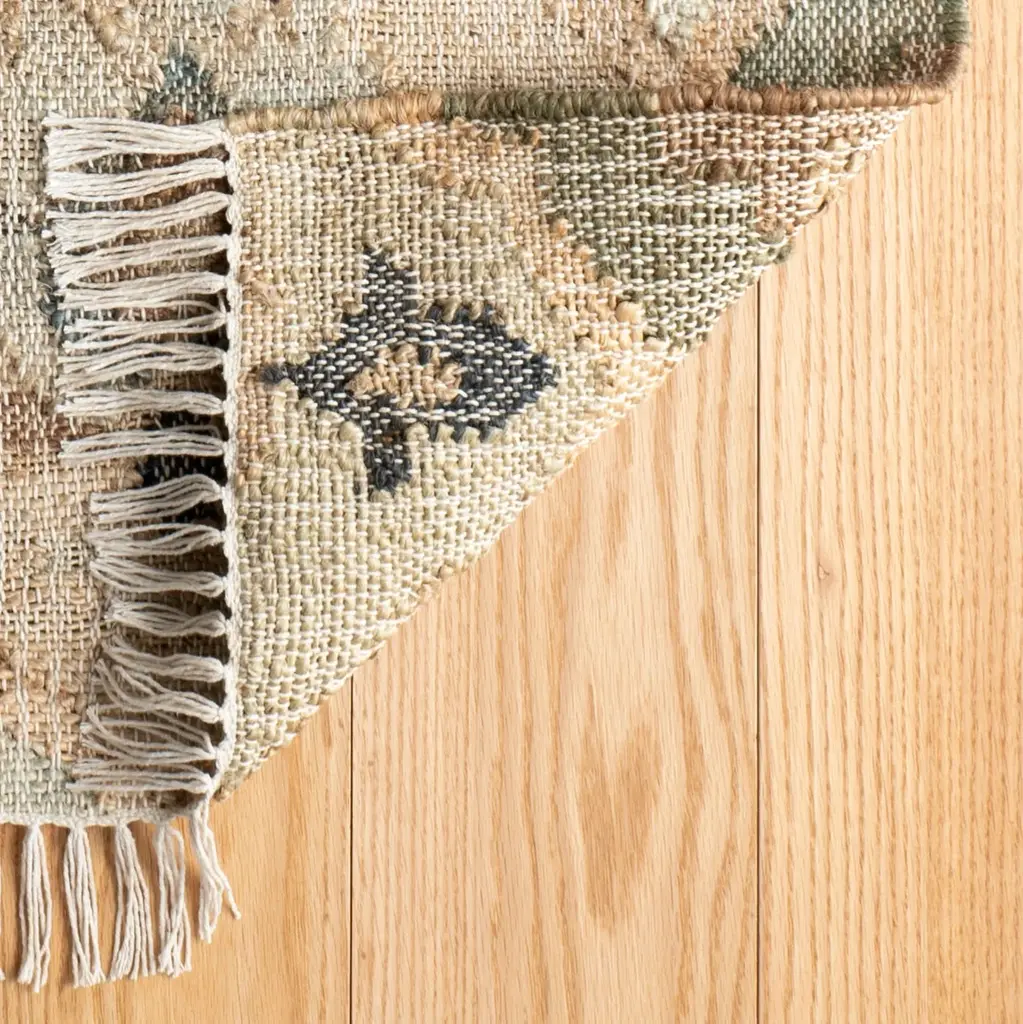 Timeless quatrefoil medallions in shades of sky, denim, natural and ivory, dhurrie woven from hardworking jute, with a touch of cotton for softness. Sustainable, biodegradable and renewable, jute adds orglamic character and rustic chic to any room.