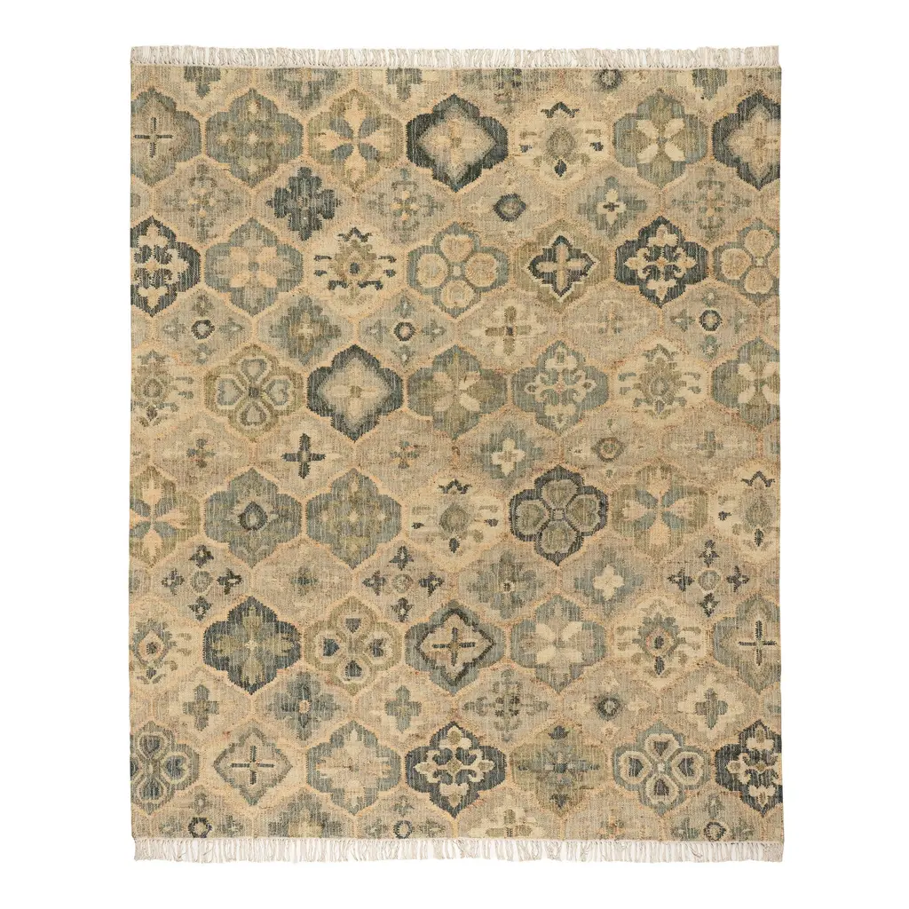 Timeless quatrefoil medallions in shades of sky, denim, natural and ivory, dhurrie woven from hardworking jute, with a touch of cotton for softness. Sustainable, biodegradable and renewable, jute adds orglamic character and rustic chic to any room.