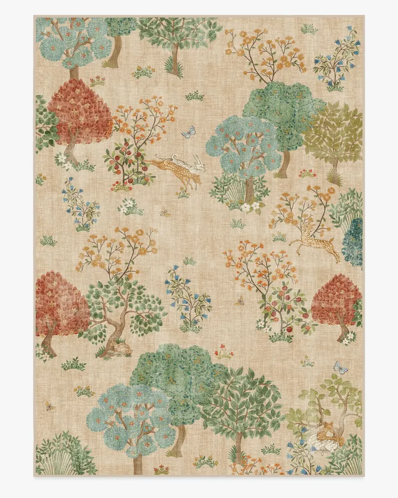 Transform your home with the charming patterns and wild woodland treasures of our Sanderson Pamir Garden Fern Rug. Referencing two Sanderson designs, Pamir Garden and Foraging, this design features a scene of floral sprigs, stylized trees, and antelopes, all interwoven with wild berries, sloes, and delicate blossom trails. The palette of reds, oranges, yellows, greens, blues, and browns is accented with pops of light cream against a light natural background. Water-resistant, stain-resistant, and machine-washable. Rug colors may vary slightly according to your device and the lighting in your space.