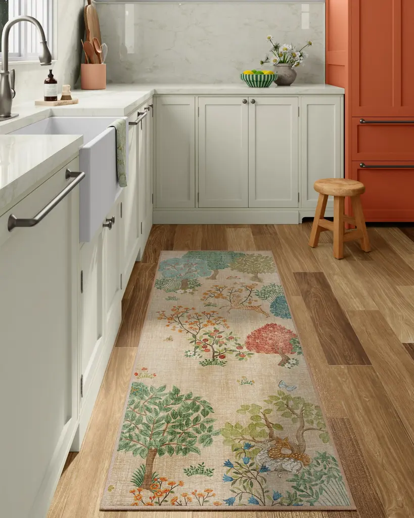 Transform your home with the charming patterns and wild woodland treasures of our Sanderson Pamir Garden Fern Rug. Referencing two Sanderson designs, Pamir Garden and Foraging, this design features a scene of floral sprigs, stylized trees, and antelopes, all interwoven with wild berries, sloes, and delicate blossom trails. The palette of reds, oranges, yellows, greens, blues, and browns is accented with pops of light cream against a light natural background. Water-resistant, stain-resistant, and machine-washable. Rug colors may vary slightly according to your device and the lighting in your space.