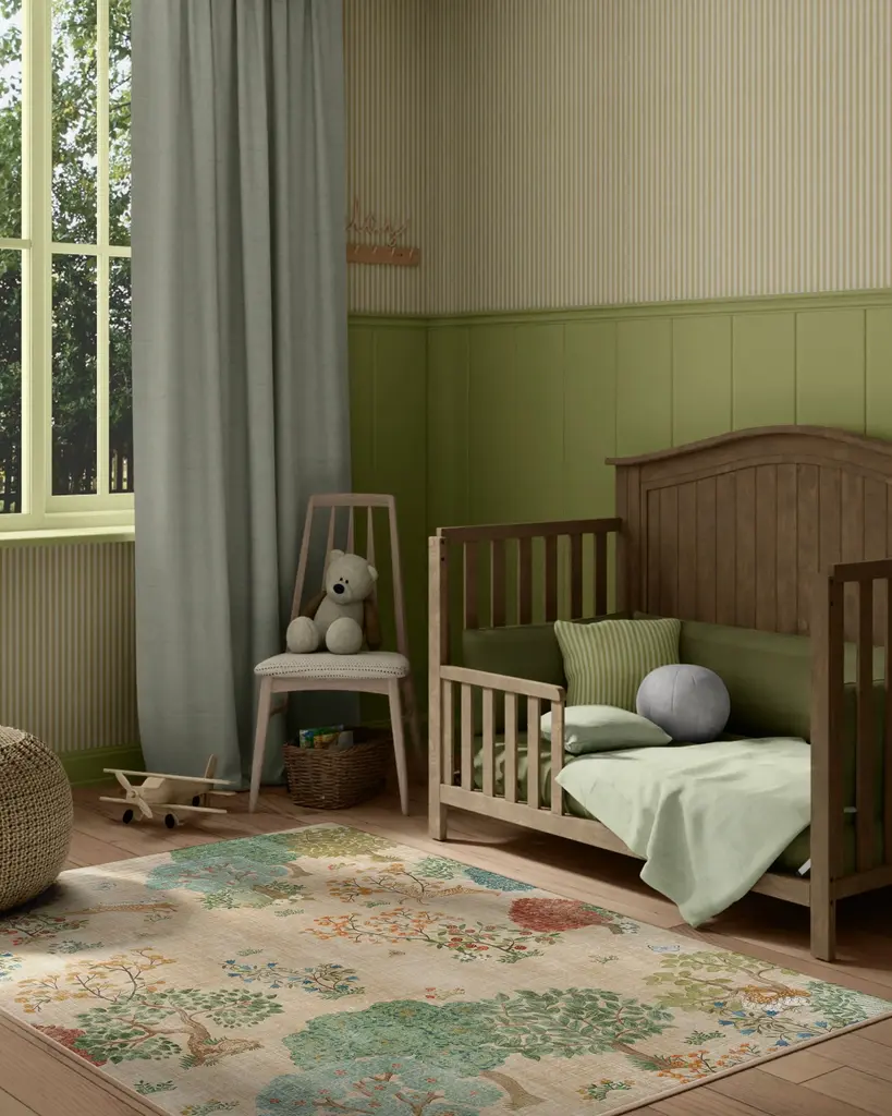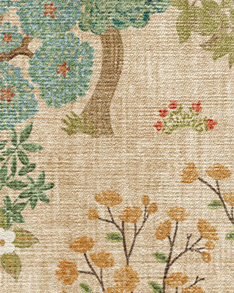 Transform your home with the charming patterns and wild woodland treasures of our Sanderson Pamir Garden Fern Rug. Referencing two Sanderson designs, Pamir Garden and Foraging, this design features a scene of floral sprigs, stylized trees, and antelopes, all interwoven with wild berries, sloes, and delicate blossom trails. The palette of reds, oranges, yellows, greens, blues, and browns is accented with pops of light cream against a light natural background. Water-resistant, stain-resistant, and machine-washable. Rug colors may vary slightly according to your device and the lighting in your space.