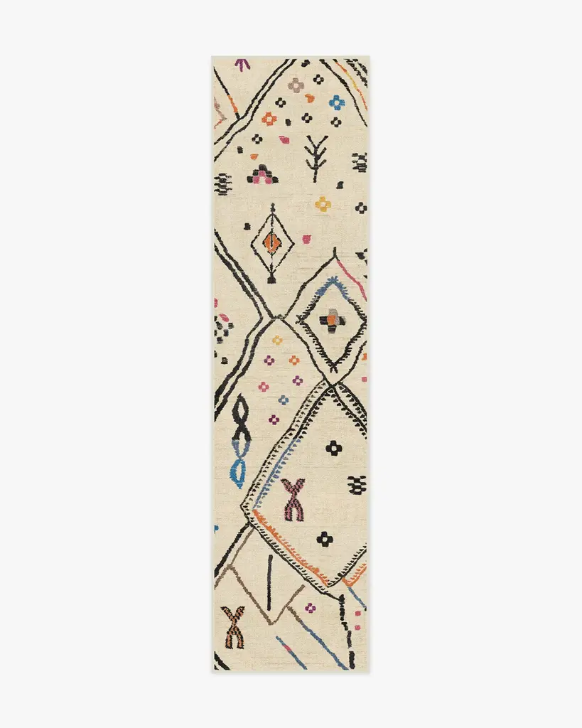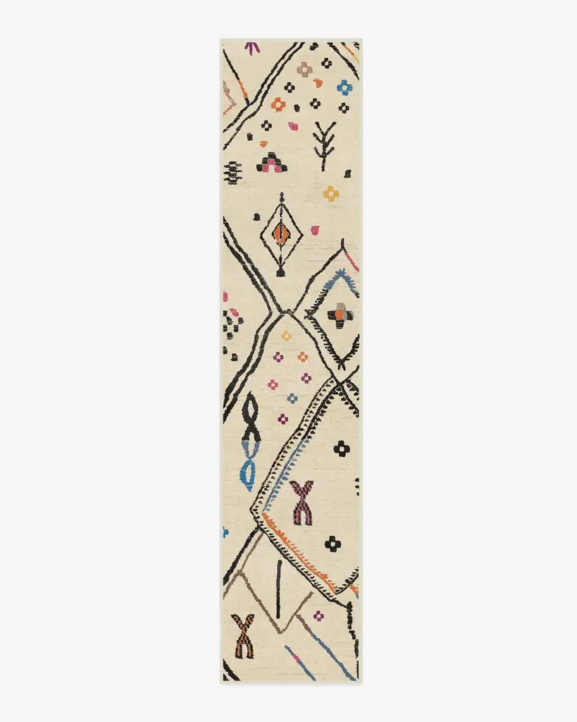 Bring home the vibrant charm of our Pamir Ivory Multicolor Rug. Inspired by Azilal Moroccan designs, this bold style bursts with bright pops of color. With vivid shades of pinks, electric blues, ochre yellows, and hints of charcoal against a warm cream background, the organic linework provides a homey, hand-woven feel.. Water-resistant, stain-resistant, and machine-washable. Rug colors may vary slightly according to your device and the lighting in your space.