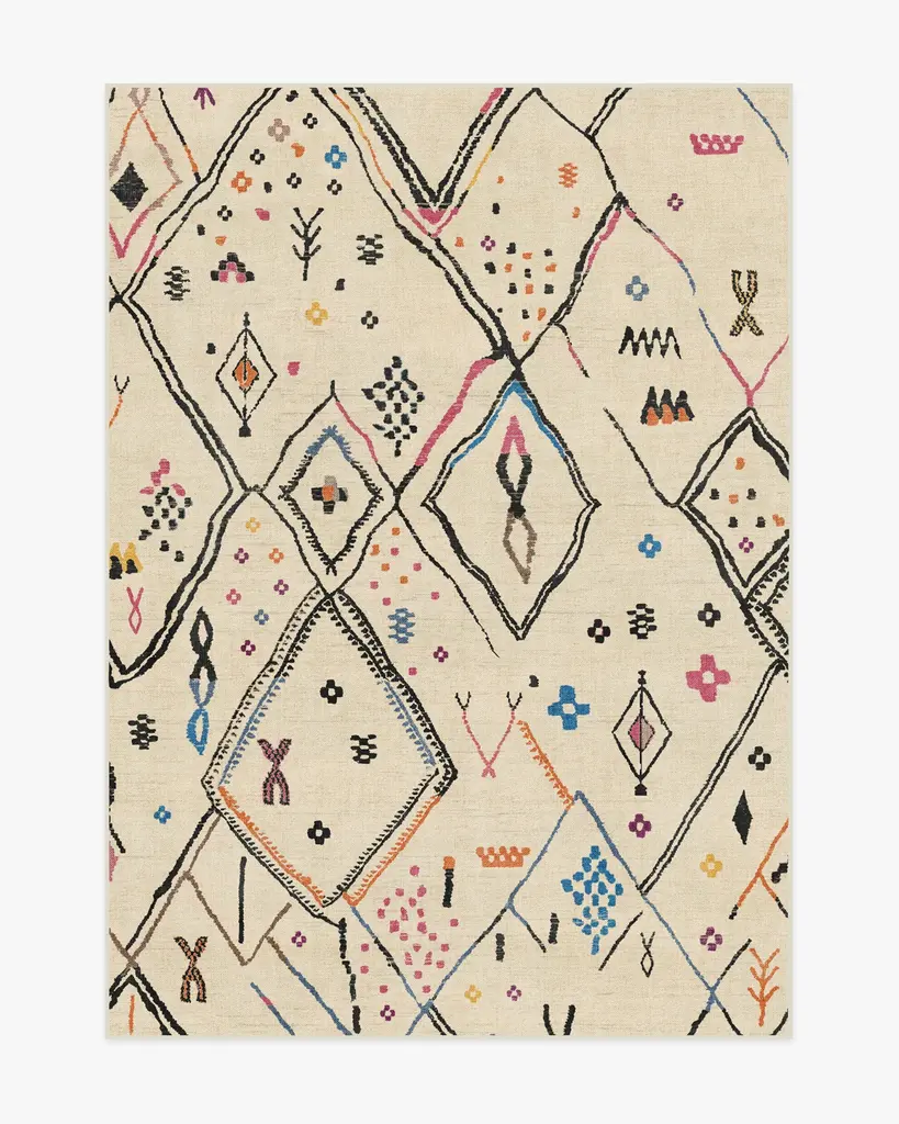Bring home the vibrant charm of our Pamir Ivory Multicolor Rug. Inspired by Azilal Moroccan designs, this bold style bursts with bright pops of color. With vivid shades of pinks, electric blues, ochre yellows, and hints of charcoal against a warm cream background, the organic linework provides a homey, hand-woven feel.. Water-resistant, stain-resistant, and machine-washable. Rug colors may vary slightly according to your device and the lighting in your space.