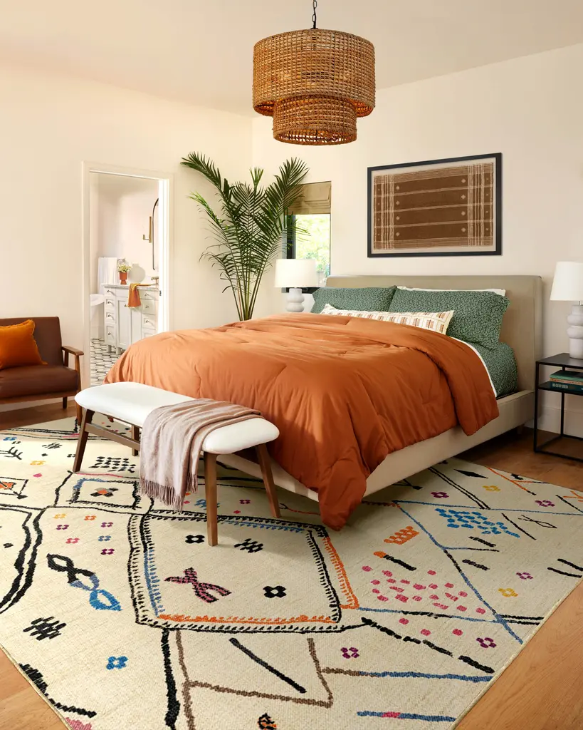 Bring home the vibrant charm of our Pamir Ivory Multicolor Rug. Inspired by Azilal Moroccan designs, this bold style bursts with bright pops of color. With vivid shades of pinks, electric blues, ochre yellows, and hints of charcoal against a warm cream background, the organic linework provides a homey, hand-woven feel.. Water-resistant, stain-resistant, and machine-washable. Rug colors may vary slightly according to your device and the lighting in your space.