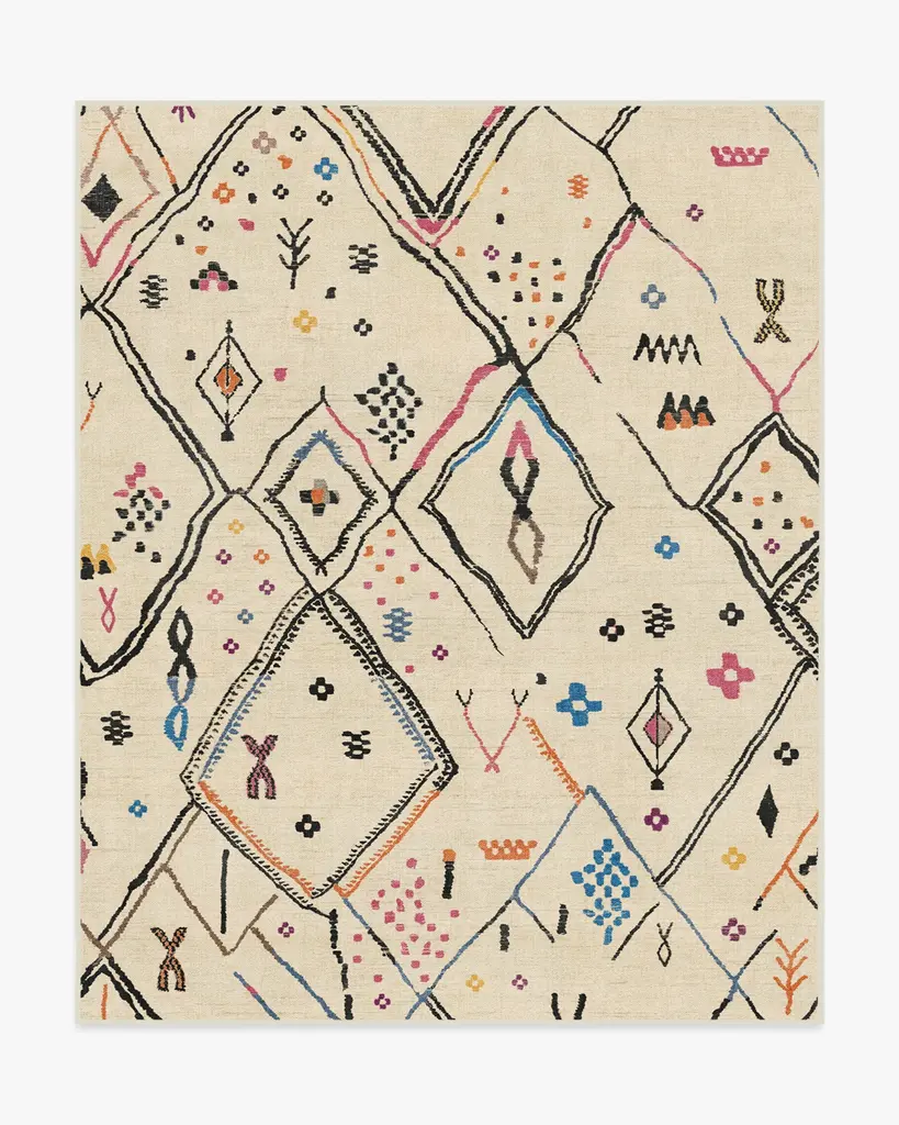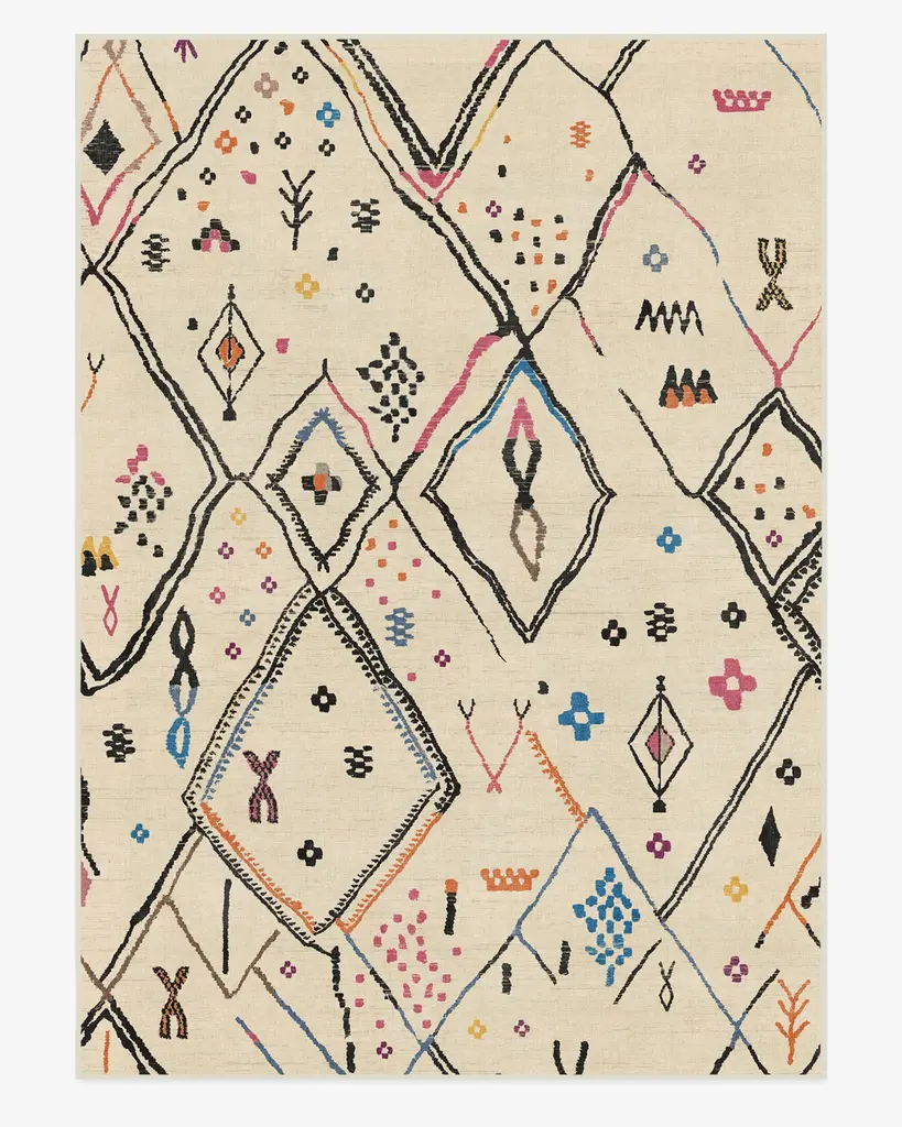 Bring home the vibrant charm of our Pamir Ivory Multicolor Rug. Inspired by Azilal Moroccan designs, this bold style bursts with bright pops of color. With vivid shades of pinks, electric blues, ochre yellows, and hints of charcoal against a warm cream background, the organic linework provides a homey, hand-woven feel.. Water-resistant, stain-resistant, and machine-washable. Rug colors may vary slightly according to your device and the lighting in your space.