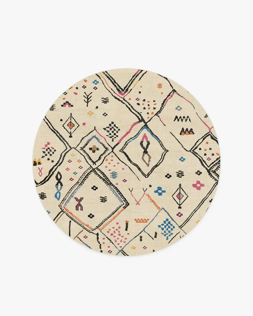 Bring home the vibrant charm of our Pamir Ivory Multicolor Rug. Inspired by Azilal Moroccan designs, this bold style bursts with bright pops of color. With vivid shades of pinks, electric blues, ochre yellows, and hints of charcoal against a warm cream background, the organic linework provides a homey, hand-woven feel.. Water-resistant, stain-resistant, and machine-washable. Rug colors may vary slightly according to your device and the lighting in your space.