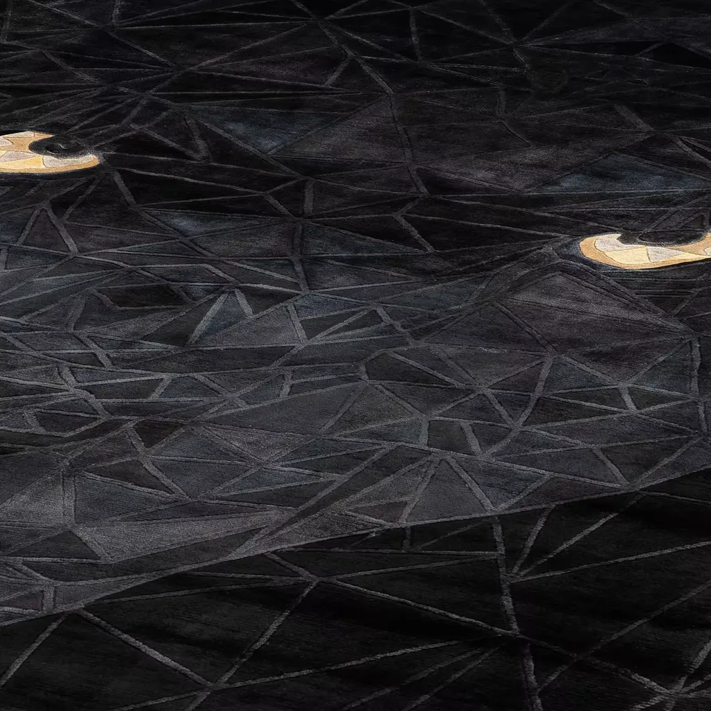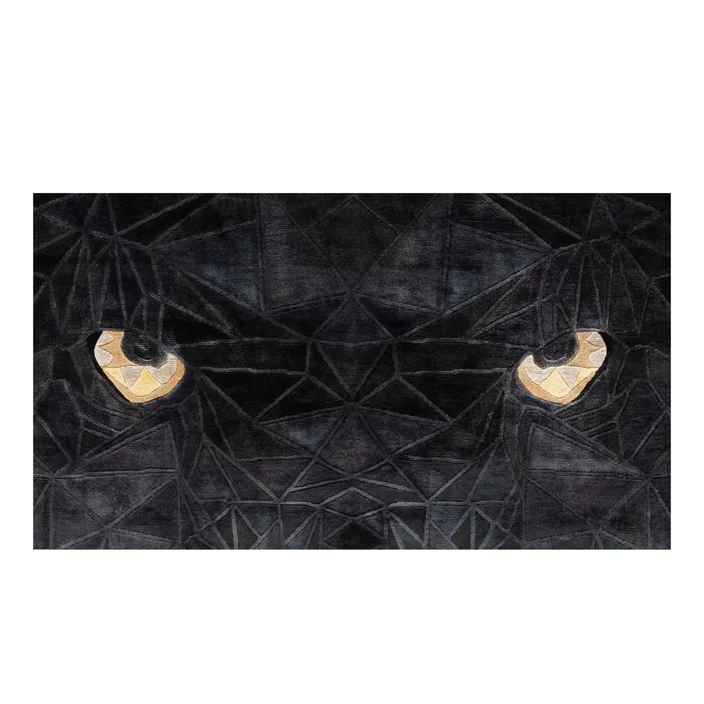 This exceptional rug exudes the powerful elegance of animal-themed artworks, here displaying a panther with a piercing look adorned with a shadow-like pattern of geometrical figures. Entirely hand-knotted by master craftsmen in Nepal, this 152,000 knot/sqm piece is made of prized silk and has a thickness of .05 cm reaching .07 cm high with the decoration. This rug can be customized and purchased in a stain-resistant variant at an additional price by contacting the Concierge.