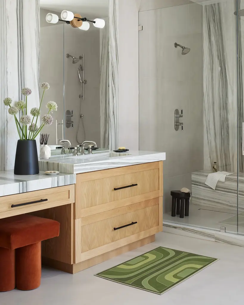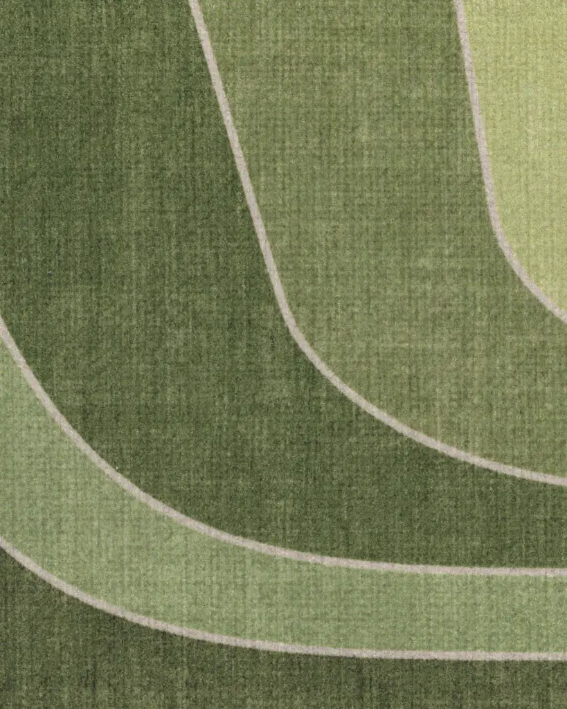 Make a statement with our Jonathan Adler Paradox Green Rug. This geometric design features an all over engineered design featuring large, graceful curved lines. Its palette of deep forest greens, warm citrus greens, and deep sages, adorned with soft grey linework, creates a harmonious blend of colors that exudes modern glamour. Water-resistant, stain-resistant, and machine-washable. Rug colors may vary slightly according to your device and the lighting in your space.