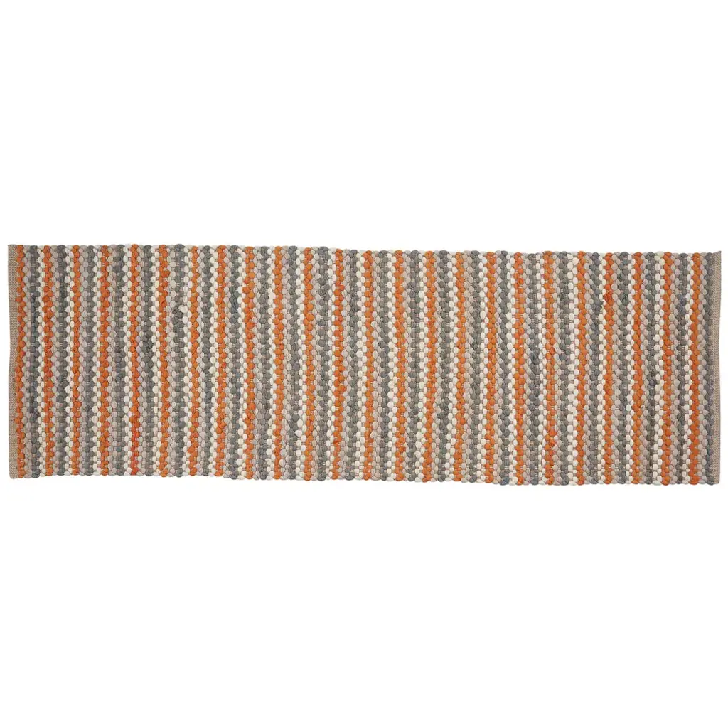 Combine a subtle pattern with warm colors for a refreshing, lively flooring addition. Provides a comforting living room, kitchen, or dining room atmosphere for guests and loved ones delivered by the soft and protective essence of this decorative scatter rug. The vibrant orange color paired by the cream and gray shades in a woven stripe design that will blend with a variety of interior home styles to reuse as a complementary seasonal or casual home statement accessory.