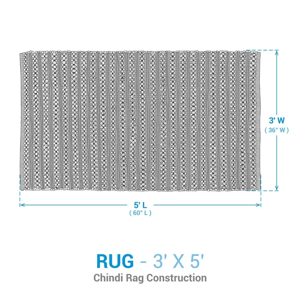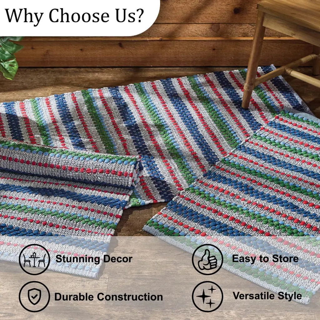 Create a relaxing retreat in your home space by incorporating the thickly braided element of this striped chindi rug. Constructed from hand loomed and hand dyed cotton rags for a long-lasting and durable flooring accent perfect to enhance any living space, providing an inviting path for guests and loved ones throughout the year. The versatile stripe design combines with the calming color palette of blue, green, red, and gray hues for a unique flooring accent that will add interest and dimension to any nautical, coastal, lakehouse, cabin, and lodge home decor.