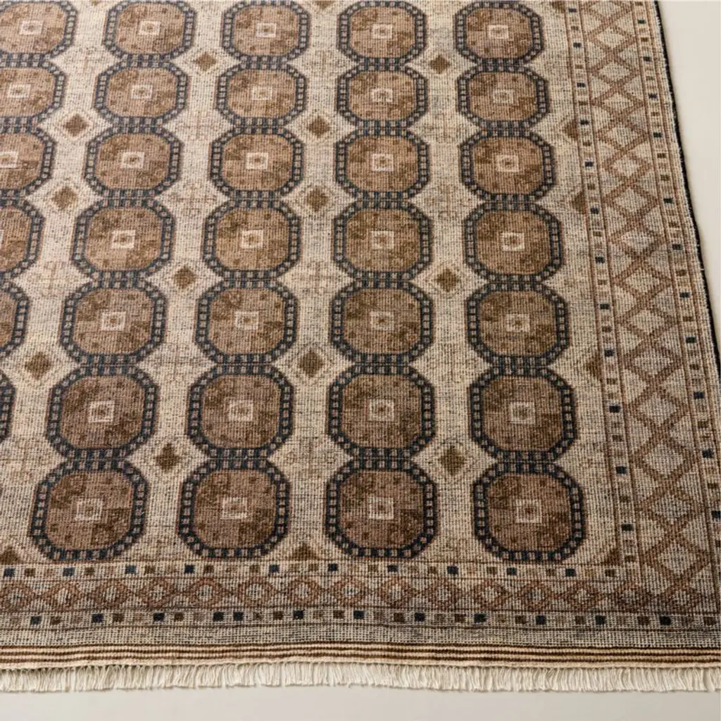 Rooted in the geometric artistry of traditional Turkish and Caucasian rugs, this hand-knotted wool rug brings a storied pattern into a modern context. Rows of intricate octagonal medallions anchor the intricately detailed design, each one connected by a lattice of diamond and cross-shaped formsa subtle nod to heritage craftsmanship. Rendered in a muted palette of cream, warm brown and black, the rug tempers its bold geometry with understated elegance. CB2 exclusive.How will it look in your room? 12"x12" rug samples are available in stores for a fee refundable upon return of the sample.