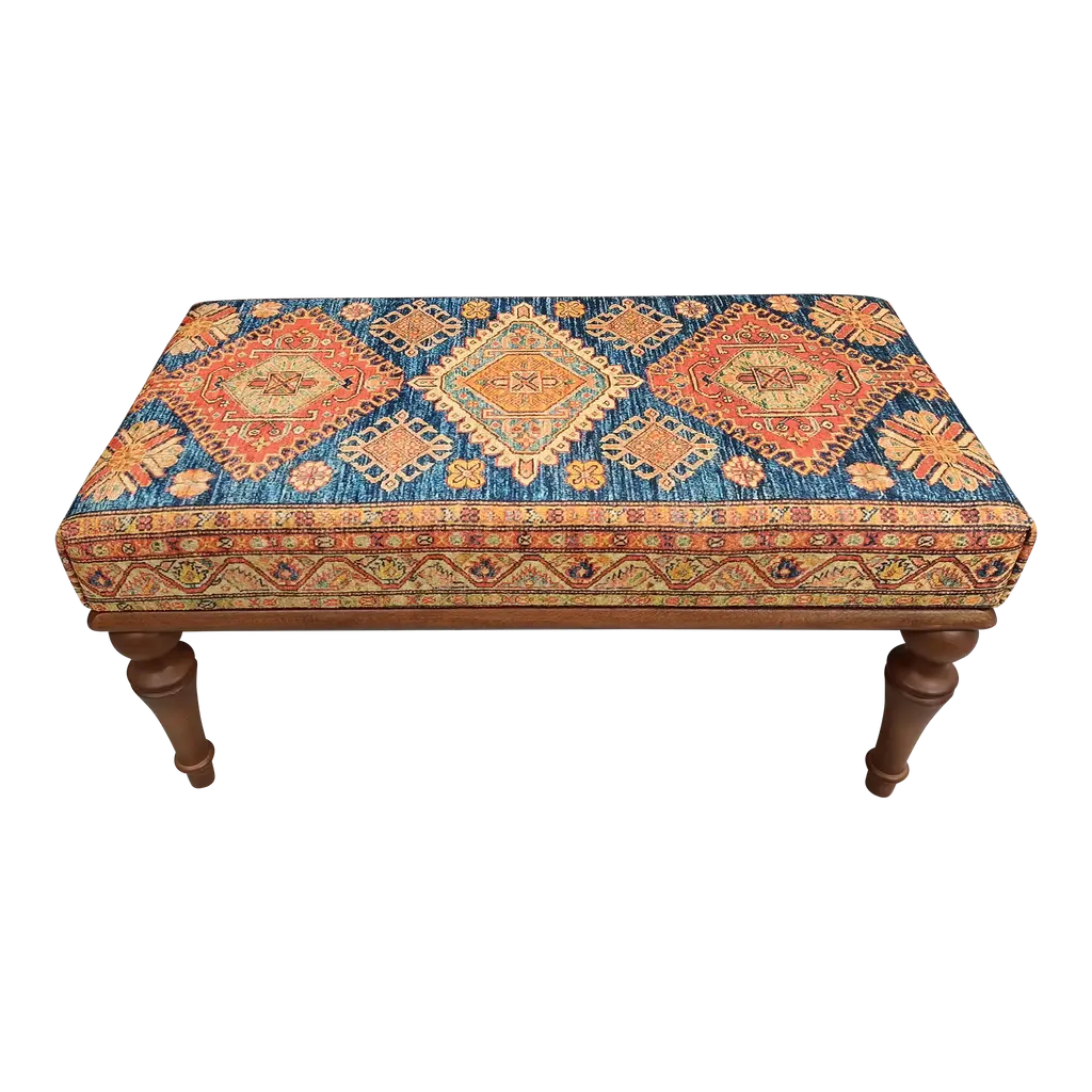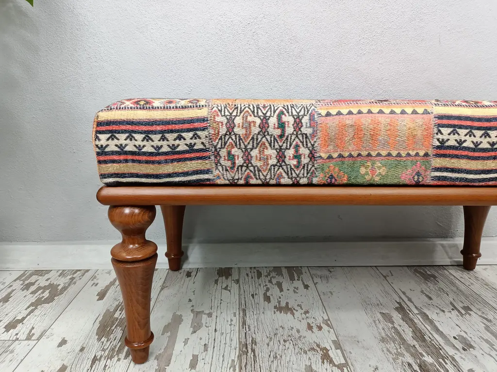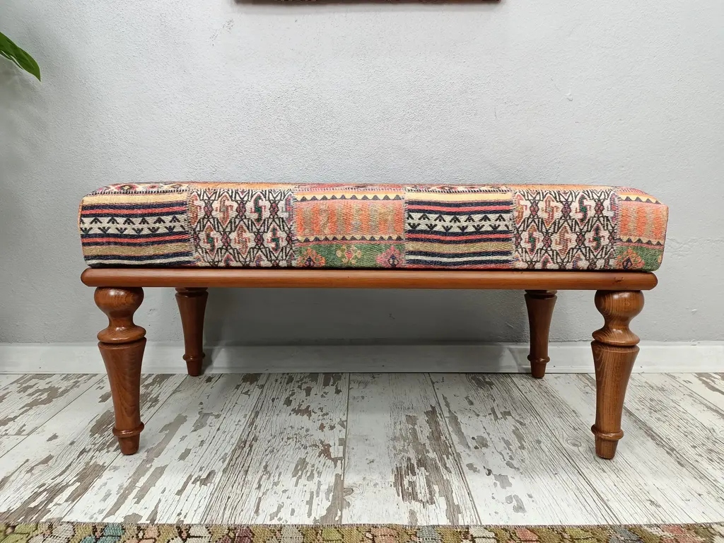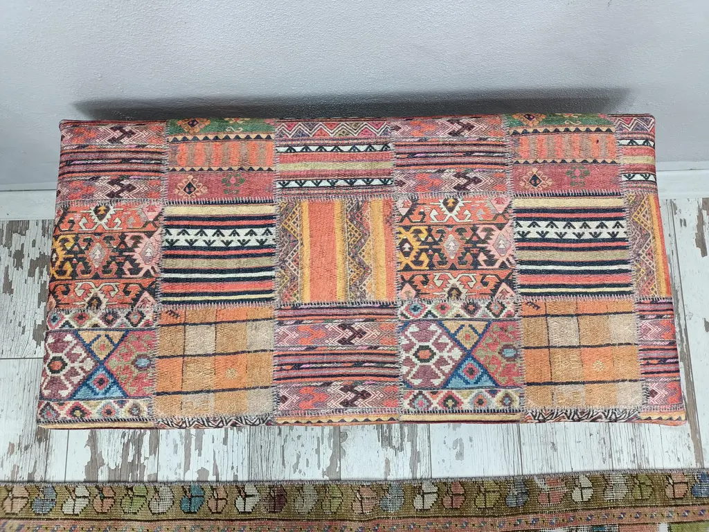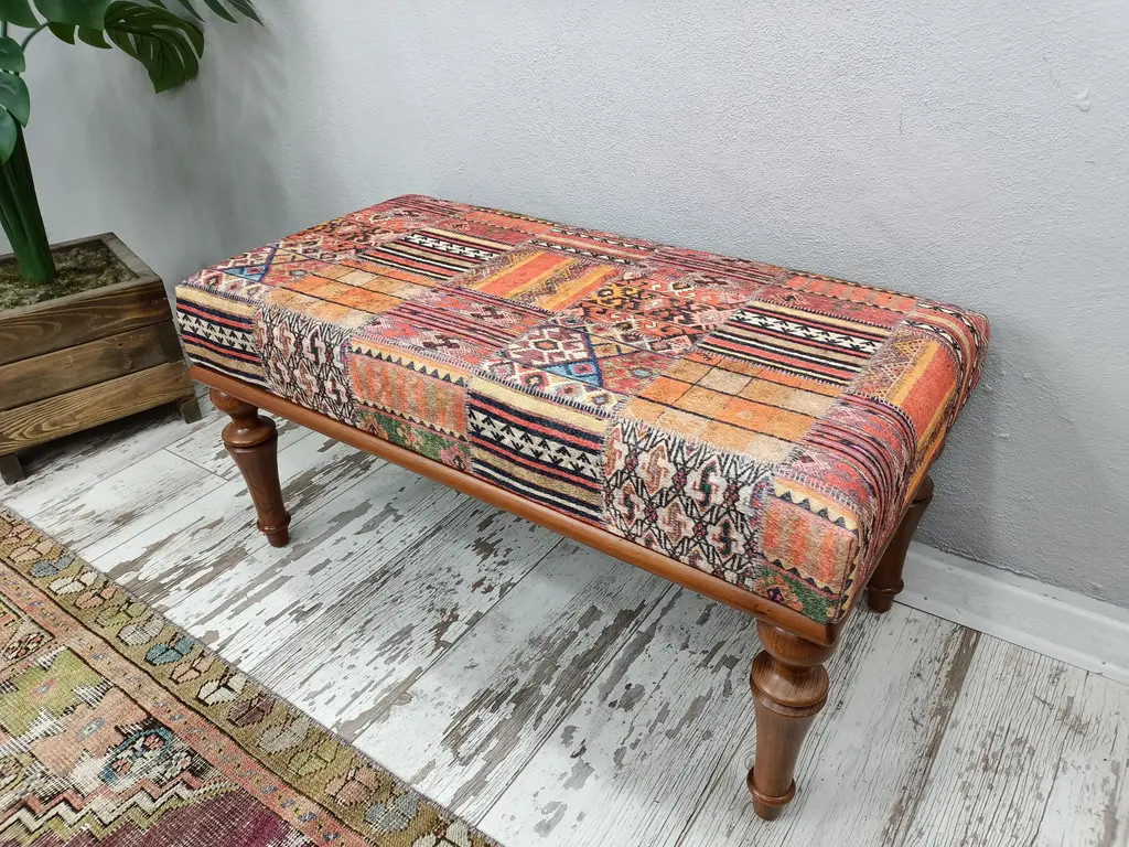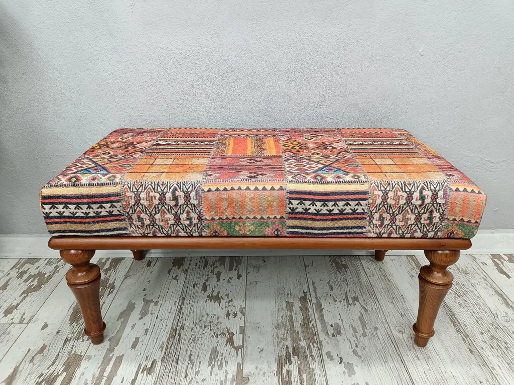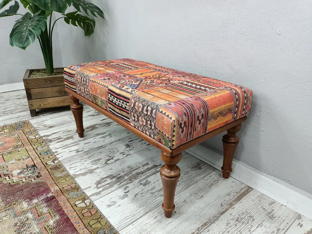Details SIZE: 18X18X36 Inches ( with legs ) - 45x45x90 cm TYPE: Handmade Ottoman Bench CONDITION: is good. CONSTRUCT: It will come with disassemble legs, you can easily put together ottoman top table ( body ) with legs. There is disassembled legs with screw. Set up time around 30 seconds. Please use soft floor to set up. MATERIALS: Printed Rug, Hornbeam Body, Textile and zipper backside, poplar wood inside CLEANING: Professionally Cleaned and Disinfected