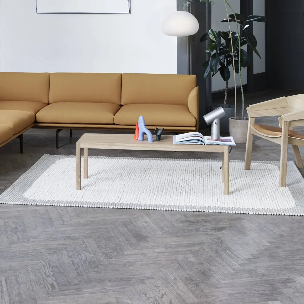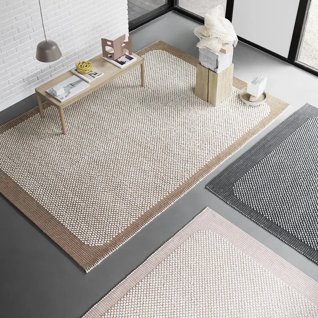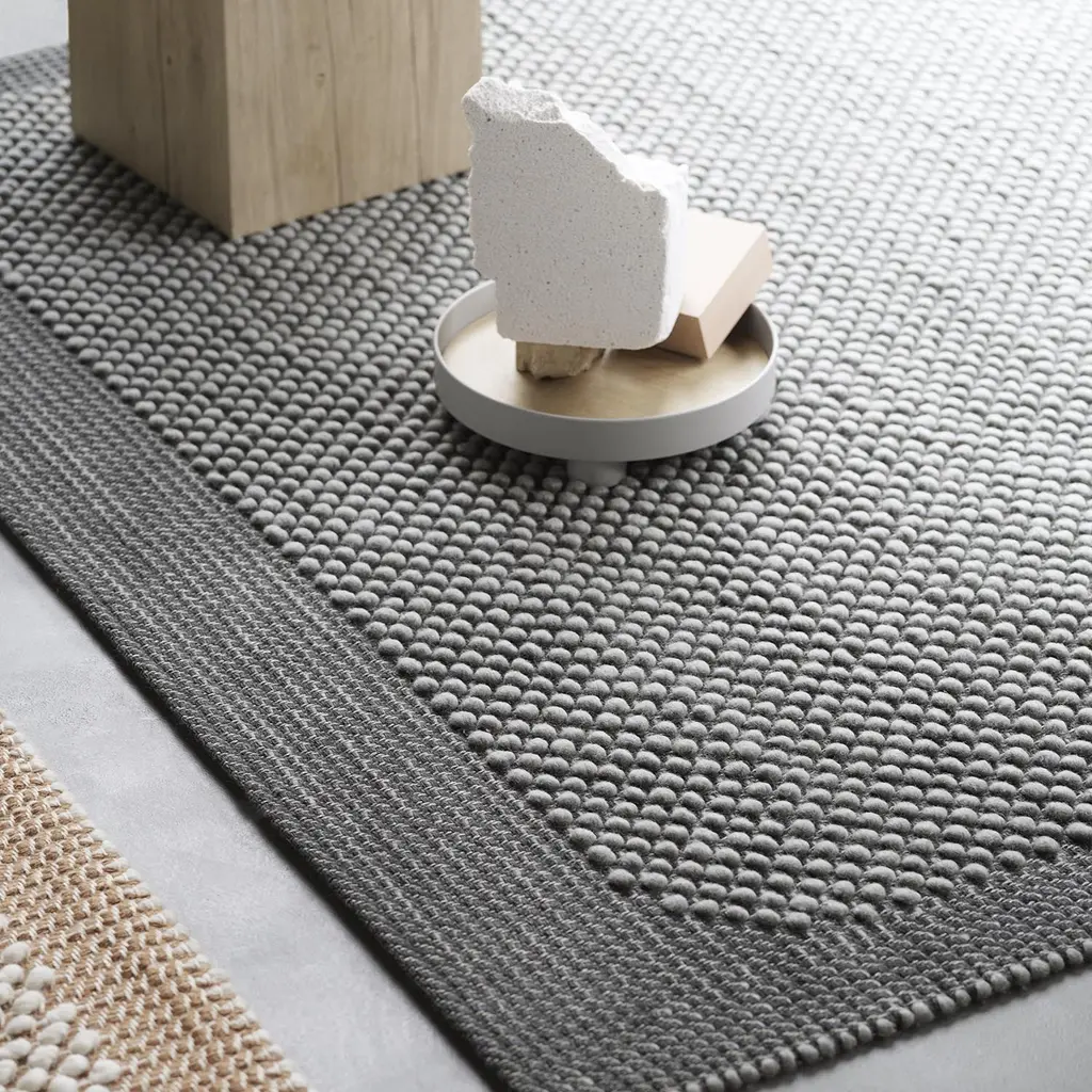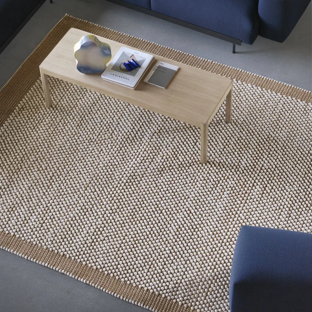 Reminiscent of a smoothly pebbled beach, this handwoven rug plays its soft woolen loops against a jute canvas background. Pebble Rug has a versatile look that suits both residential settings as well as hospitality, hotel or co-working spaces. Hardwearing and sturdy, the rug’s natural fibers make it easy to clean and its canvas backing fused with latex keeps it laying smoothly on the floor.