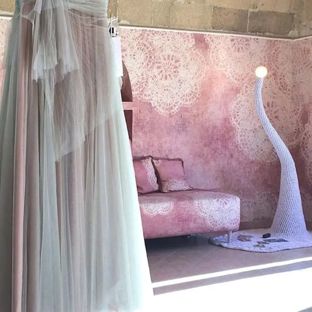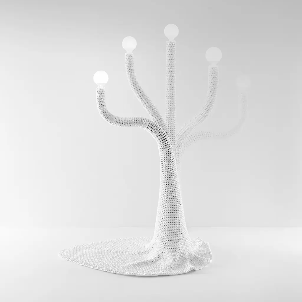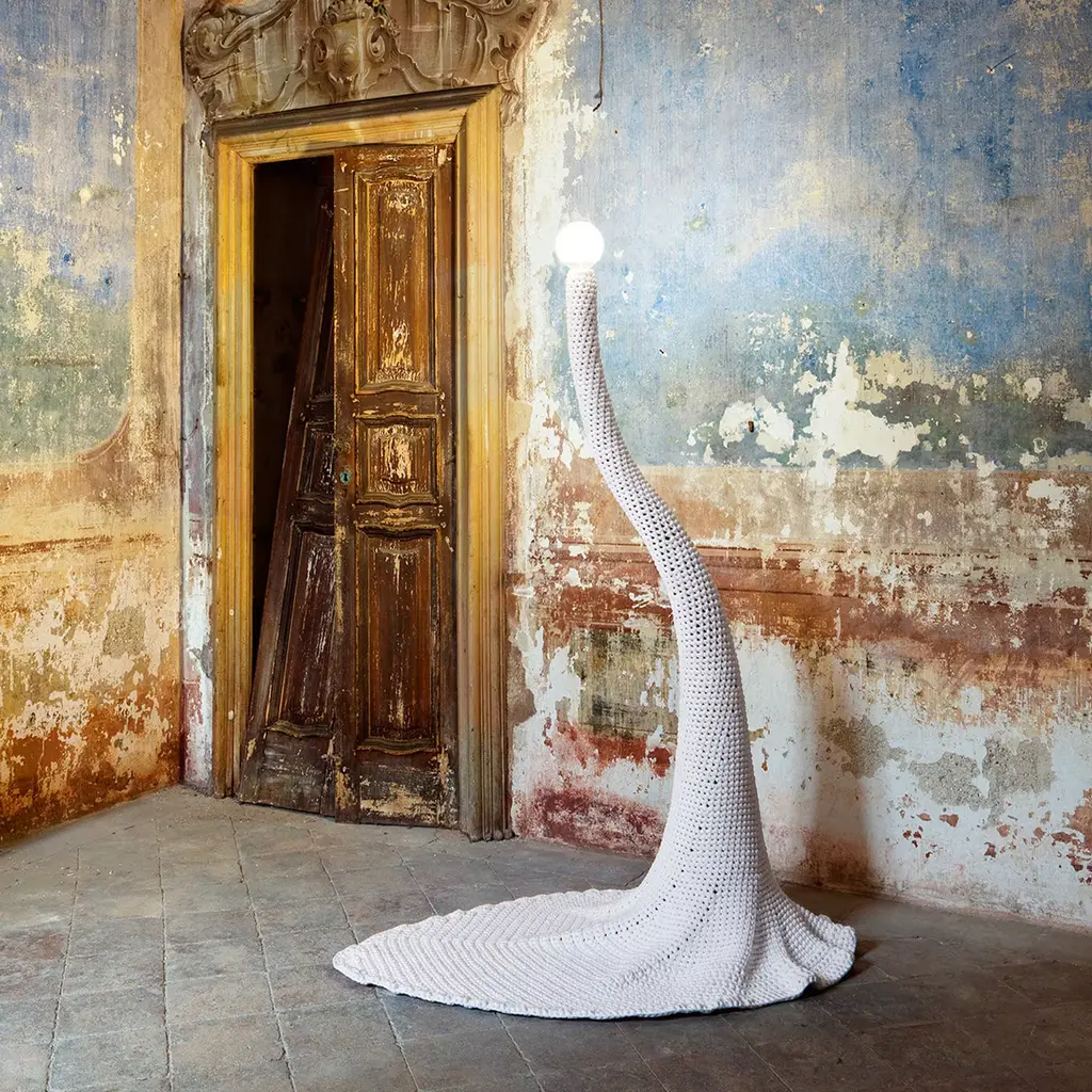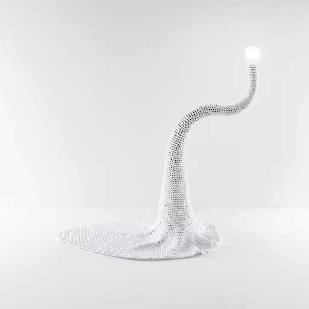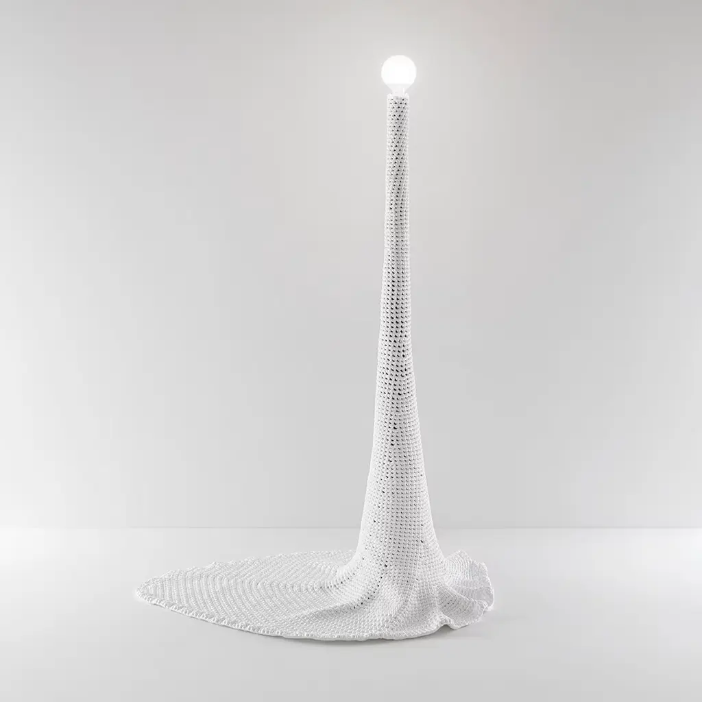 An homage to the mythological weaver Penelope - Odysseus's wife - this handcrafted floor lamp was conceived as a hybrid between a rug and a lamp. Its sinuous structure in a glossy, black-lacquered aluminum rod is fully concealed under a mantle in white crochet woven using fireproof fibers. Thanks to the "flex and stay" technology, its upper section can be moved and adapted to several positions for customized lighting. The showcased spherical bulb is not included with purchase.