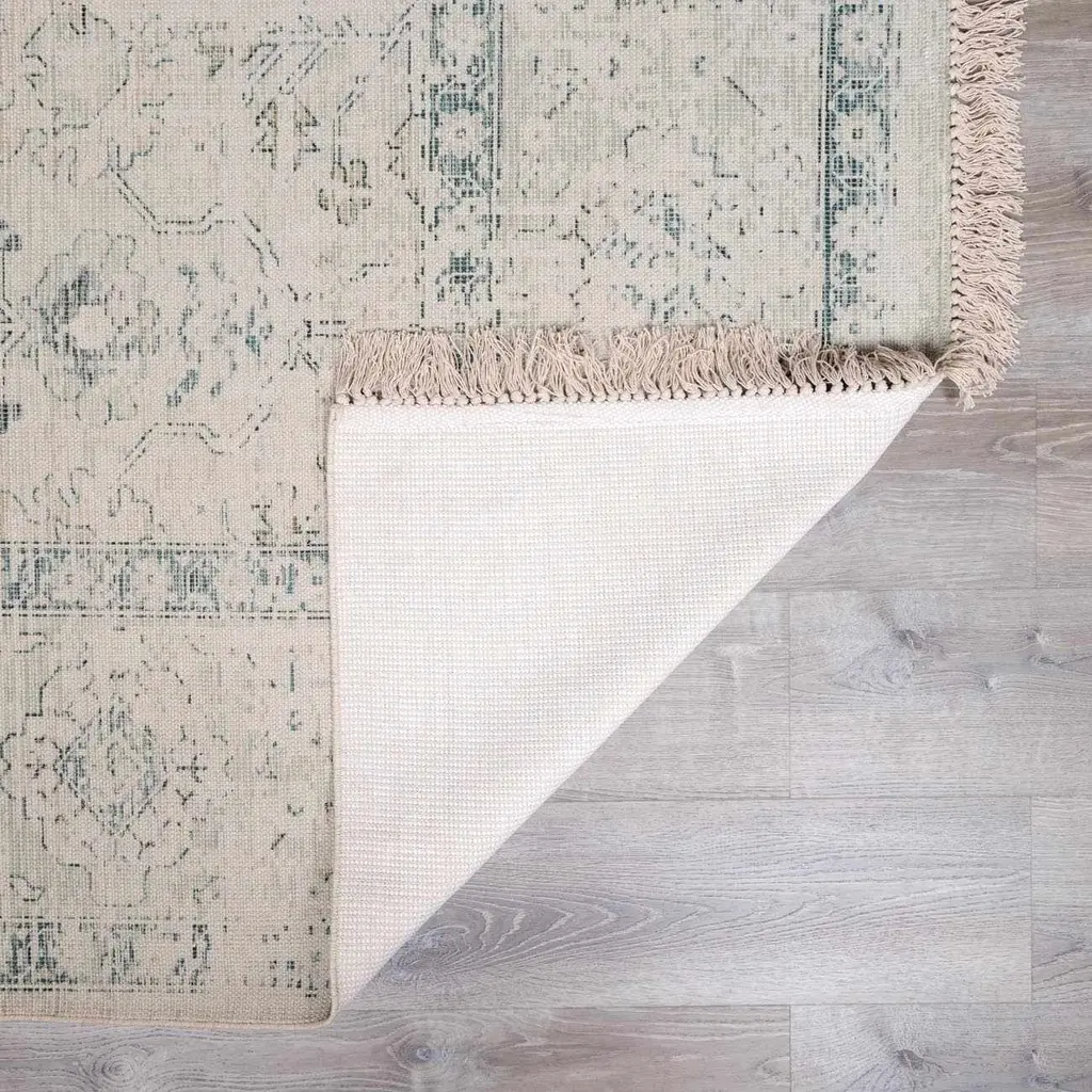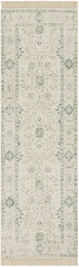 Collection: Penkridge Colors: Sage, White, Green, Olive Construction: Hand Woven Material: 70% Cotton, 30% Polyester Pile: No Pile Styles: Traditional Made In: India Thickness: 0.39" Fringe Length: 2.5" Price Range: $$$$$ (Affordable)