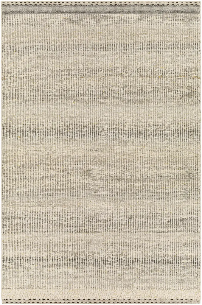 Collection: Penticton Colors: Cream, Tan, Beige, Medium Gray, Light Gray Construction: Hand Woven Material: 100% Wool Pile: No Pile Styles: Transitional,Traditional Made In: India Thickness: 0.5" Price Range: $$$$$ (Premium)