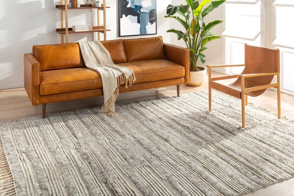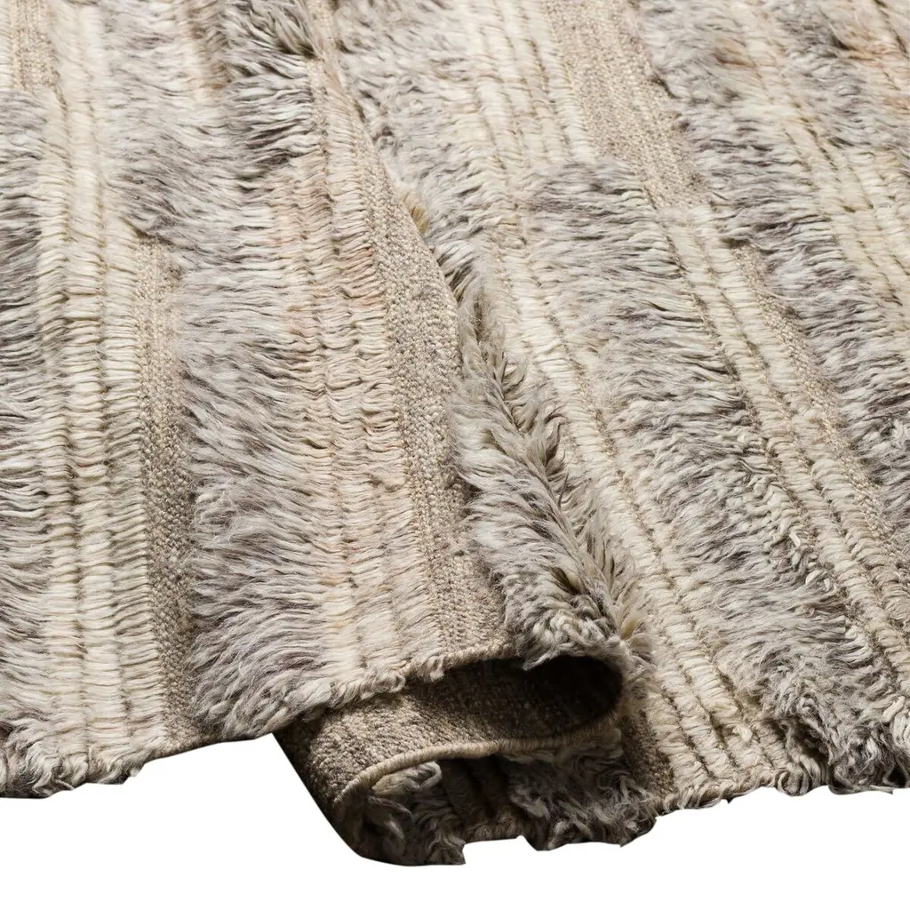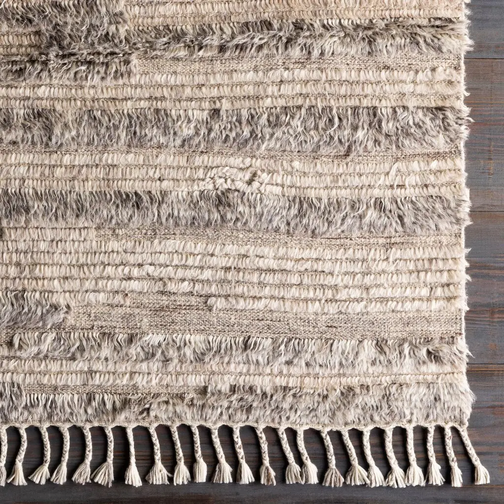 The pile of this hand-knotted wool rug varies from flat to nearly an inch high, creating fluid stripes and providing tactile intrigue. Four-inch fringe adds to the artisanal allure. A rug pad is recommended to prevent slipping and extend the life of the rug.