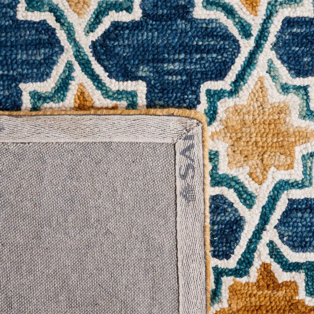 Introducing our exquisite 4' x 6' navy and yellow area rug, a perfect combination of style and craftsmanship. Designed to transform your space with a touch of Bohemian elegance, this small rectangle rug boasts a plush 1/2" pile height that provides comfort underfoot. The rug showcases a striking pattern featuring intricate geometric shapes that add a vibrant and dynamic aesthetic to any room. Masterfully hand-tufted in India, this rug is a testament to traditional techniques, made from a luxurious blend of 85% wool and 15% cotton, ensuring durability and a soft texture that you'll love to walk on. The navy background is adorned with yellow accents, creating a harmonious contrast that will complement a variety of decor themes. Ideal for your living room, bedroom, or office, this rug is not just a piece of decor; it's an investment in timeless style and quality. Elevate your home's interior with this beautiful rug that seamlessly blends bold design with artisanal craftsmanship.