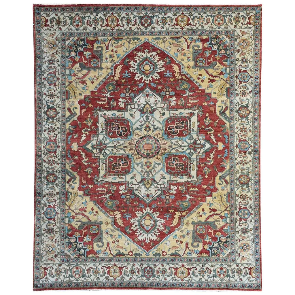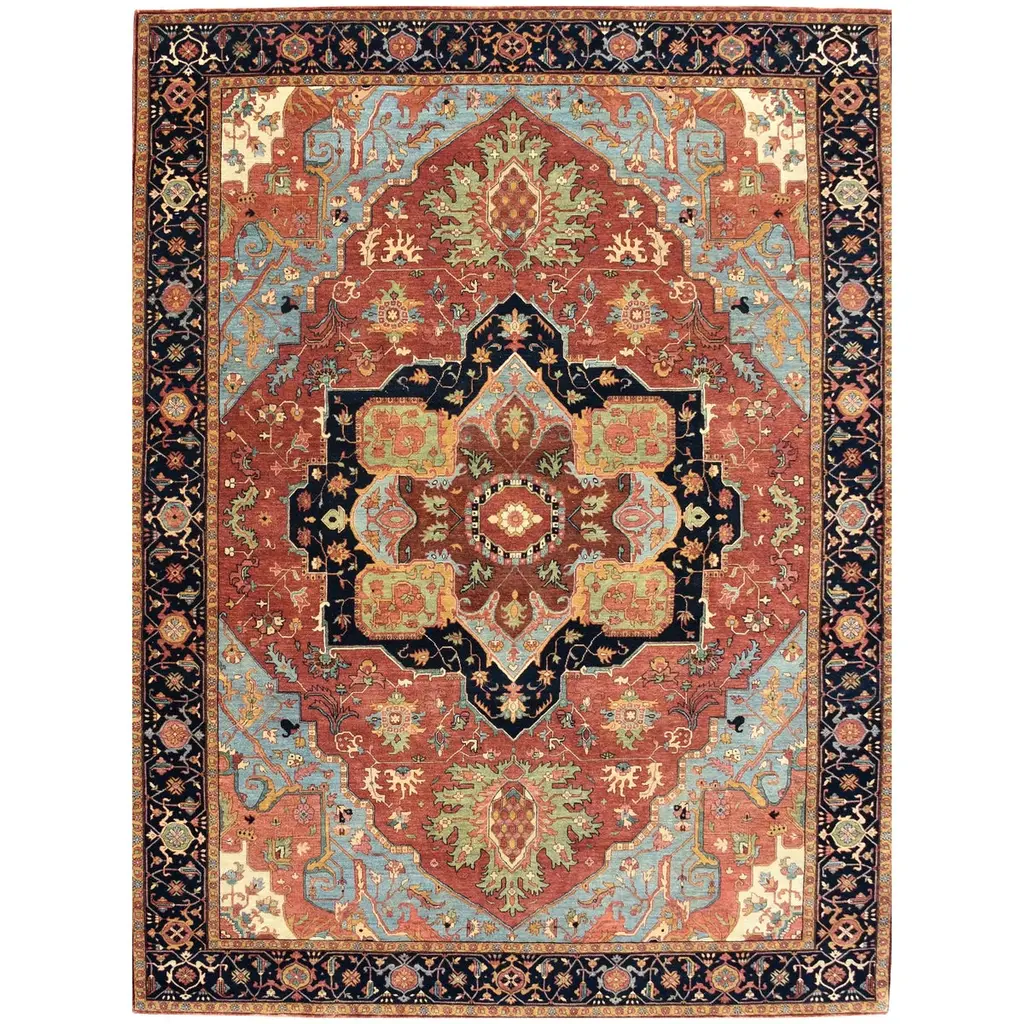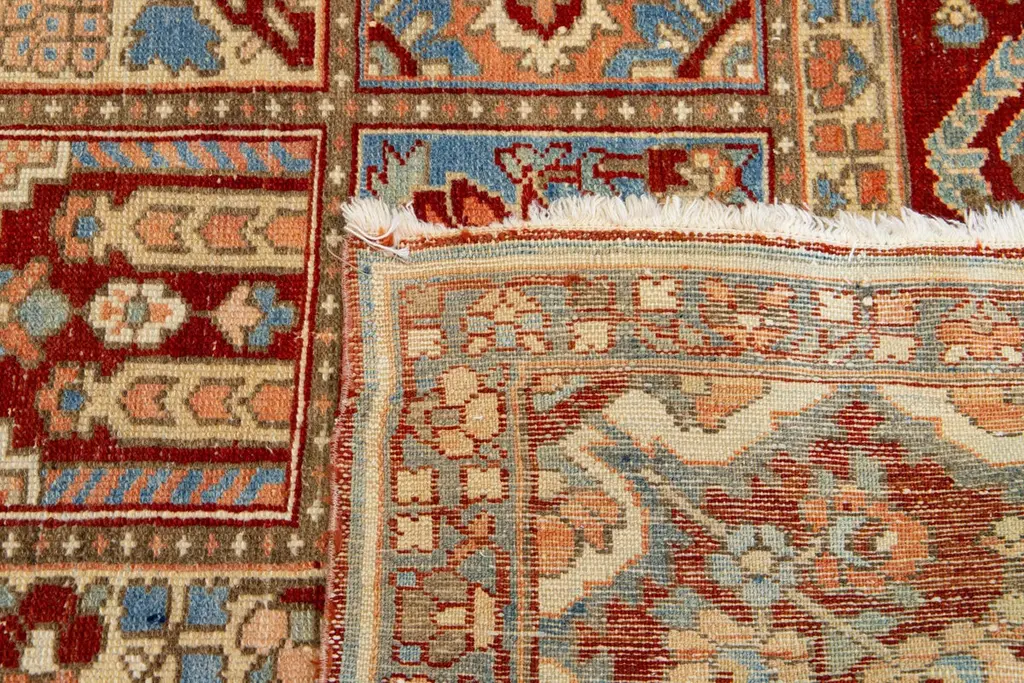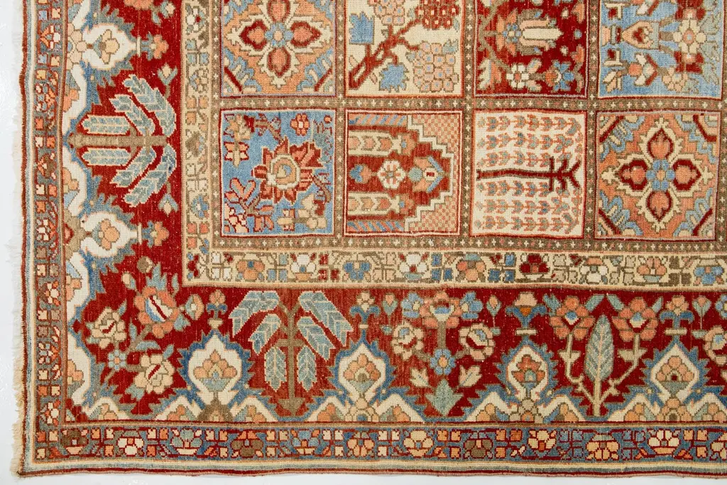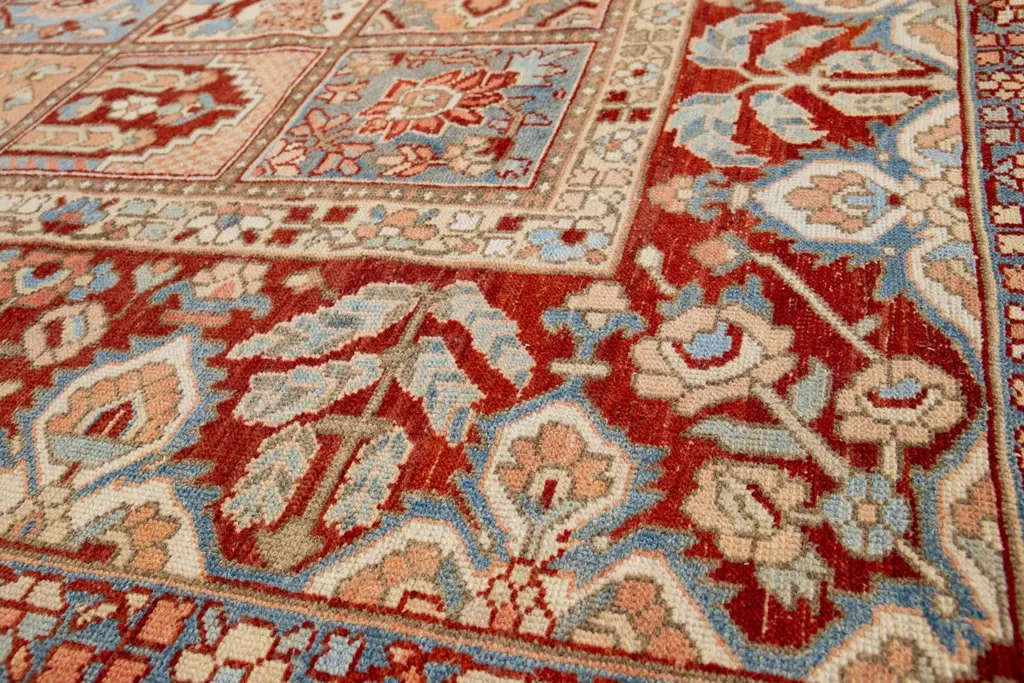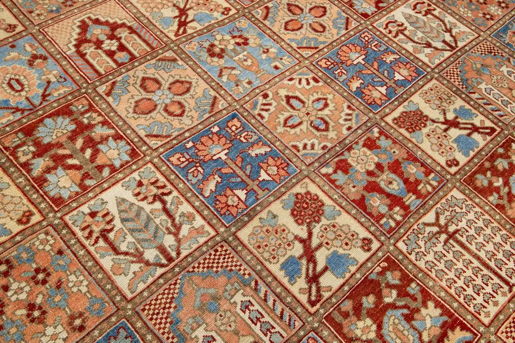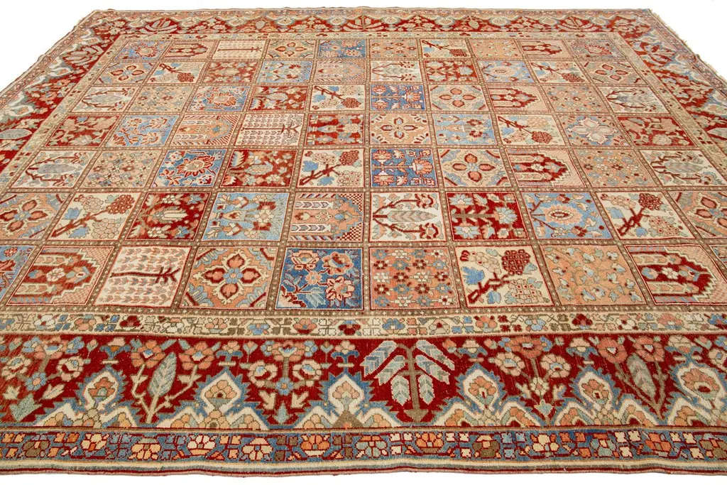 Beautiful Antique Bakhtiari hand-knotted wool rug with a red-rust, blue, beige, and peach color field. This Persian piece has a classic floral pattern.This rug measures 11' x 13'3".