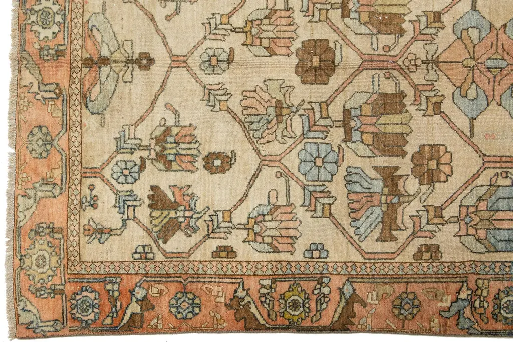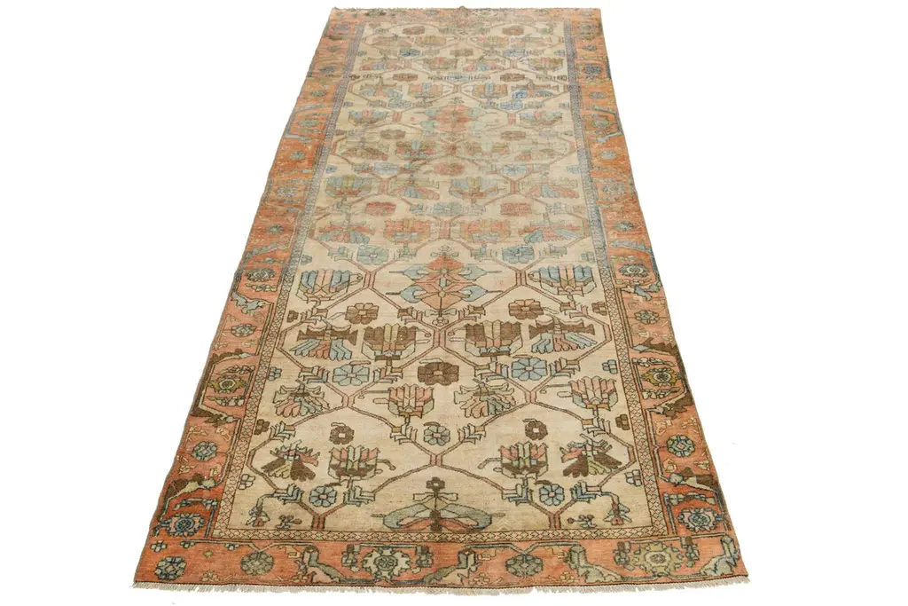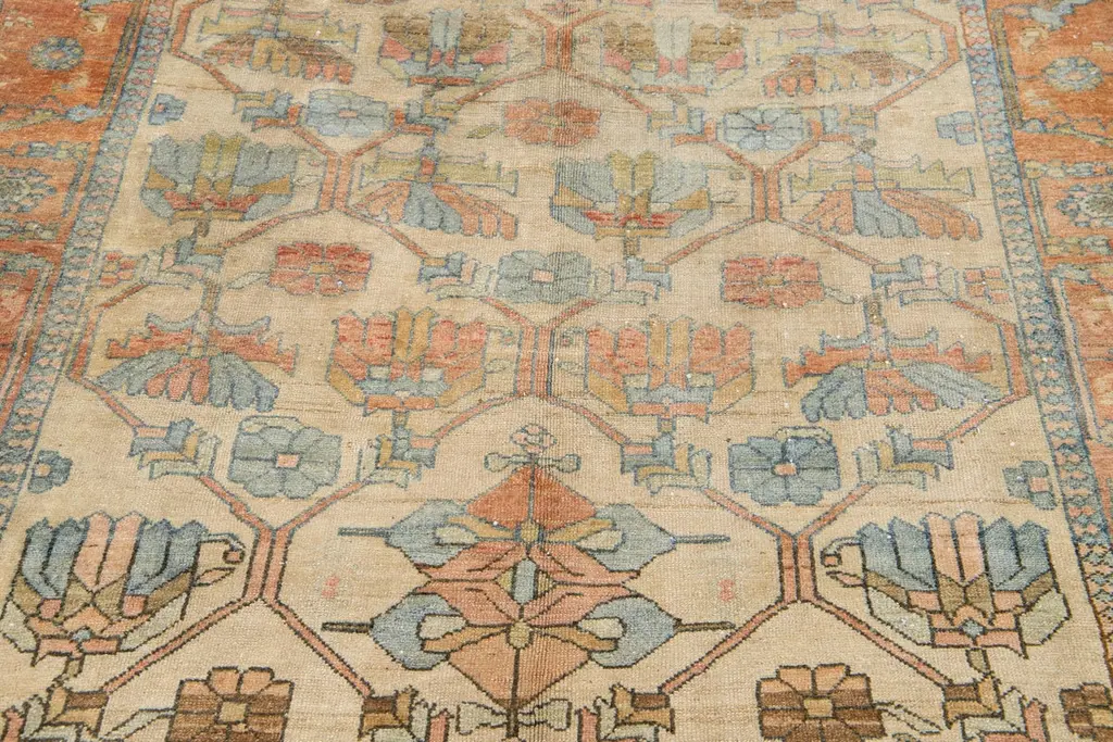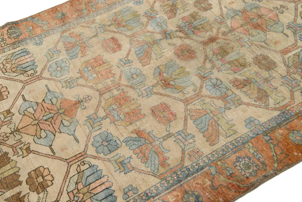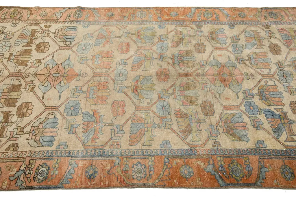 This antique Persian Malayer rug is hand-knotted wool. The design features a beautiful combination of beige and terracotta as the base, enhanced with blue highlights in a stunning, detailed floral pattern.This rug measures 4'6" X 10'5".