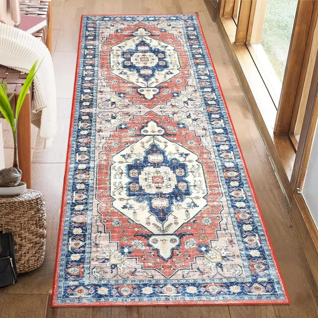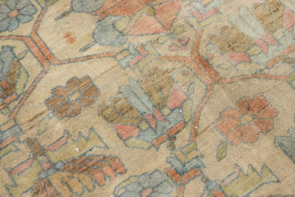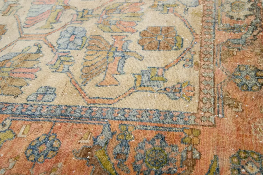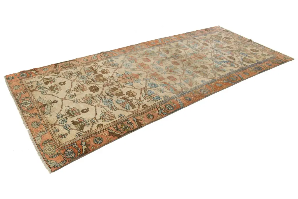 This antique Persian Malayer rug is hand-knotted wool. The design features a beautiful combination of beige and terracotta as the base, enhanced with blue highlights in a stunning, detailed floral pattern.This rug measures 4'6" X 10'5".