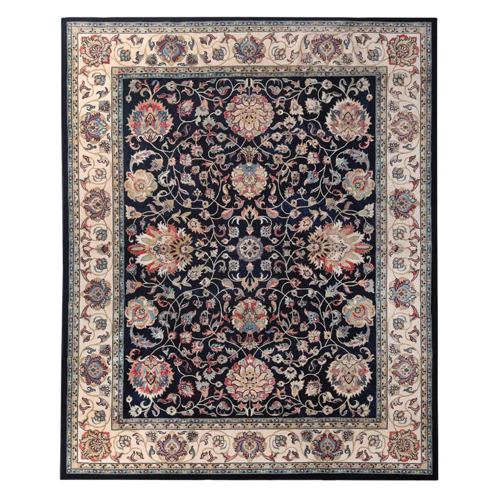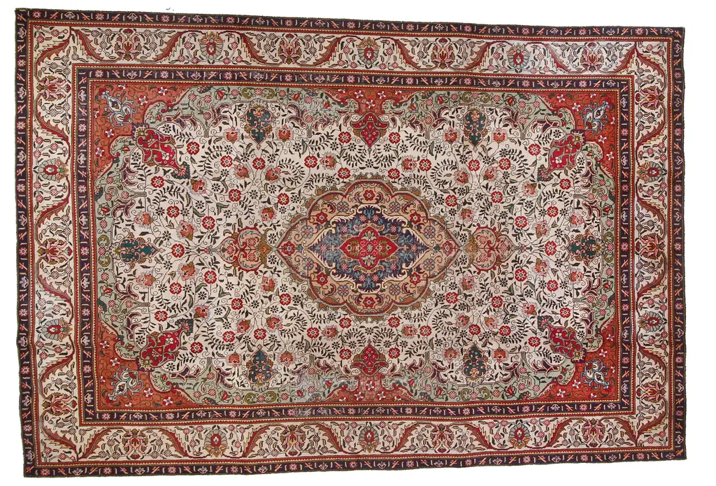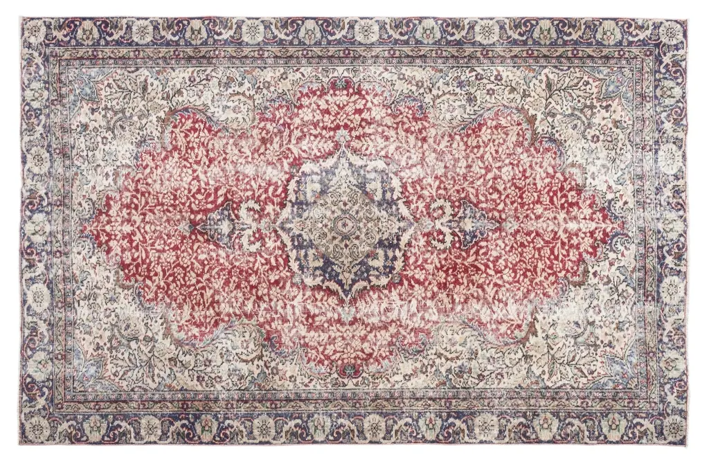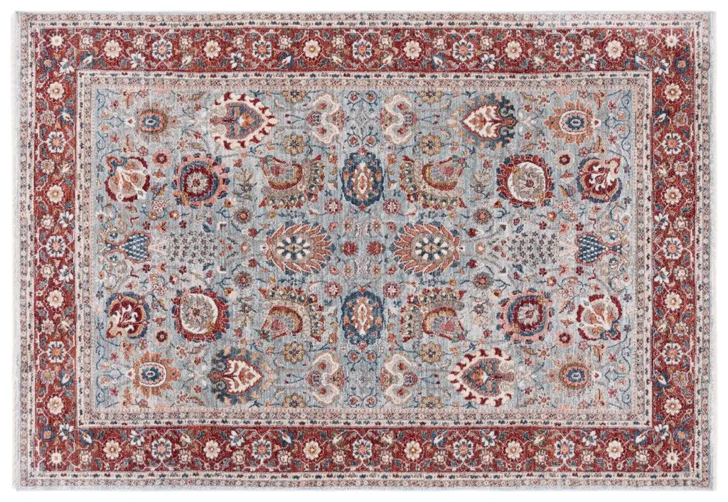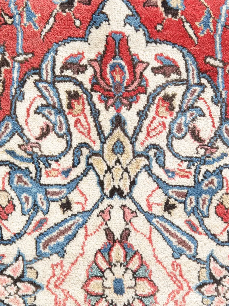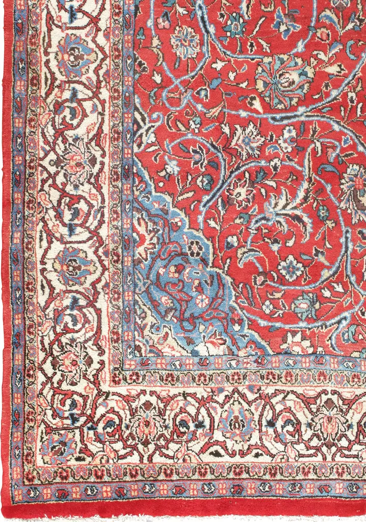 Vintage handwoven Sarouk rug featuring an ornate design on a soft red field with light blue corner spandrels.