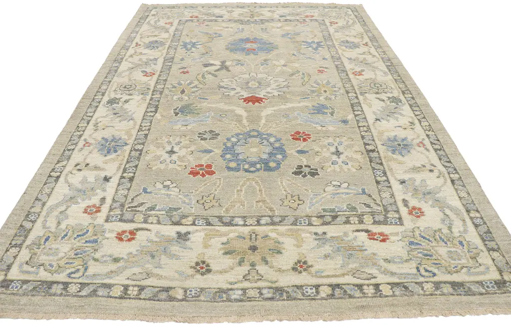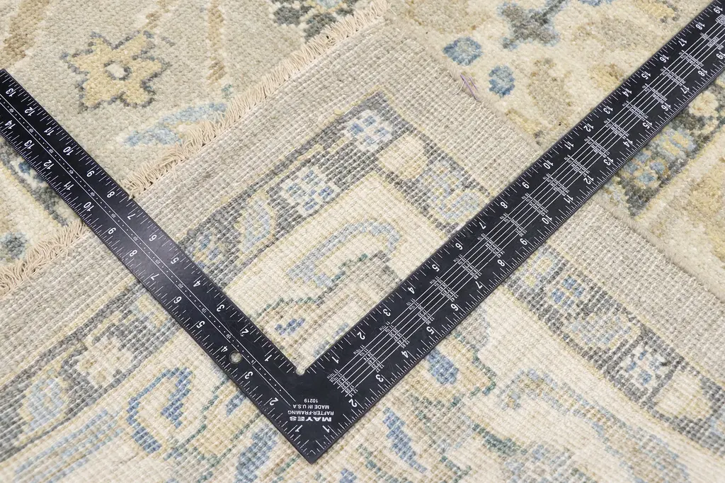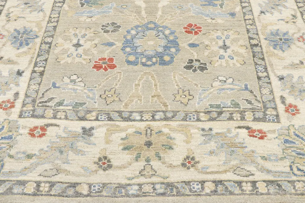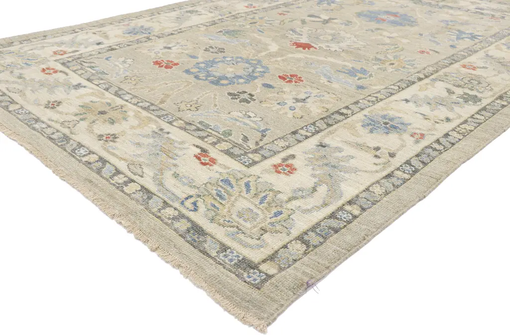 Featuring a timeless design and soft colors, serve up sophistication and modern elegance with this hand-knotted wool contemporary Persian Sultanabad rug. An array of botanical motifs decorates the abrashed taupe hued field in an elegant display of blooming palmettes, delicate vinery, stylized florals, sickle leaves, rosettes, and organic amorphous shapes. It is enclosed with a botanical leafy meander border flanked with an inner and outer meander guard band.