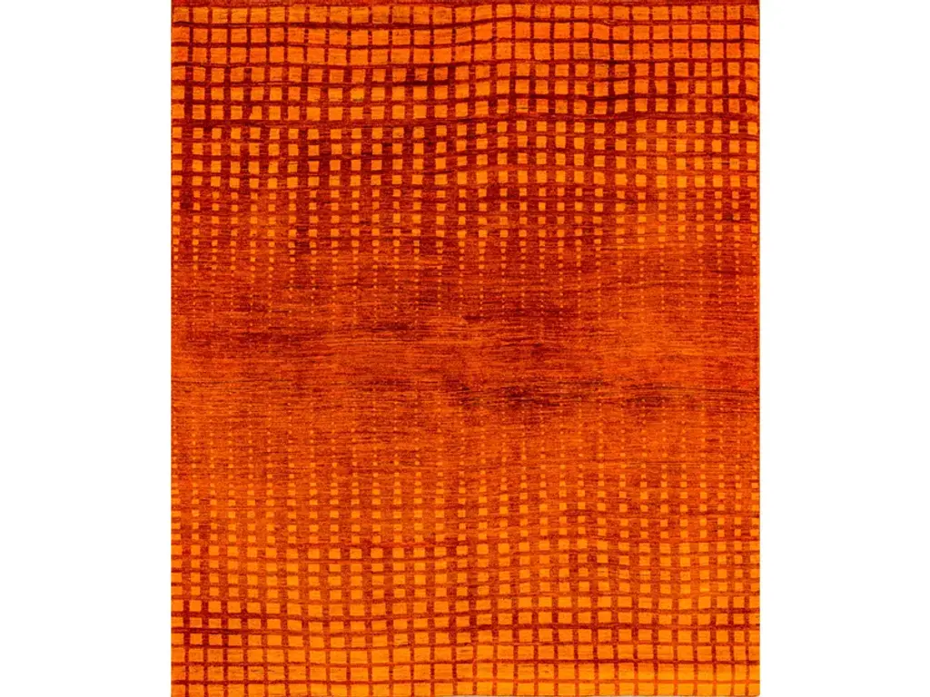 PERSPECTIVES IN ORANGE is a rectangular wool rug.Perspectives is a new collection of Gabbehs designed by Zollanvari Studio. A central linear vanishing point forms the focus of the design from which squares of augmenting dimensions emerge. This design uses the most well-known motif of geometric Gabbehs, the square, to create a thoroughly contemporary carpet in the Op Art (a term coined in 1964 by Time magazine) tradition. Op Art is a form of abstract art (specifically non-objective art) which relies on optical illusions in order to fool the eye of the viewer. The design of this carpet is a form of kinetic art and relates to geometric designs that create feelings of movement or vibration. To achieve this in a woven carpet was the challenge for our designers and weavers.