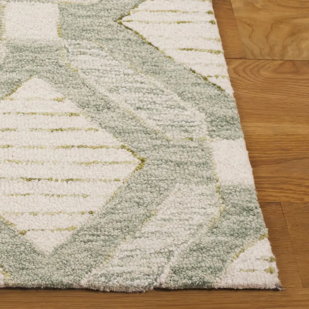 Elevate your living space with the exquisite charm of our Sage and Ivory modern area rug, size 3 feet by 5 feet. This small rectangular rug boasts a pile height of 3/8 inches, offering a subtle elevation that enhances its plush feel underfoot. Exclusively crafted in India, this hand-tufted masterpiece is made with a rich blend of materials comprising 80% Wool for warmth and durability, 10% Cotton for a soft touch, and 10% Latex to maintain its shape and stability over time. The modern style of this rug is beautifully expressed through its sophisticated geometric pattern, showcasing a rhythmic interplay of sage green lattice designs overlaying a creamy ivory backdrop that radiates elegance and contemporary flair. Perfect for any room seeking an update, this rug promises to add a touch of serenity and style to your decor. Indulge in the luxury of wool with a rug that brings comfort, quality, and designer aesthetics to your home.